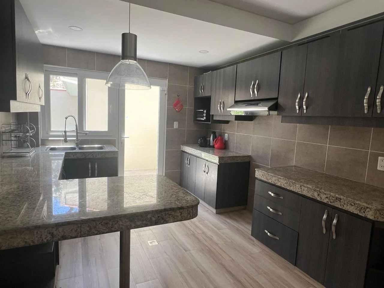 ☑︎ Cocina con mobiliario superior e inferior, mesones de granito y pisos de porcelanato