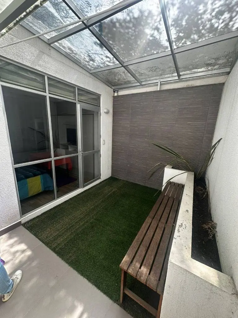 Dispone de un patio techado con pasto sintético tipo solario, perfecto para disfrutar de un ambiente cálido y privado.