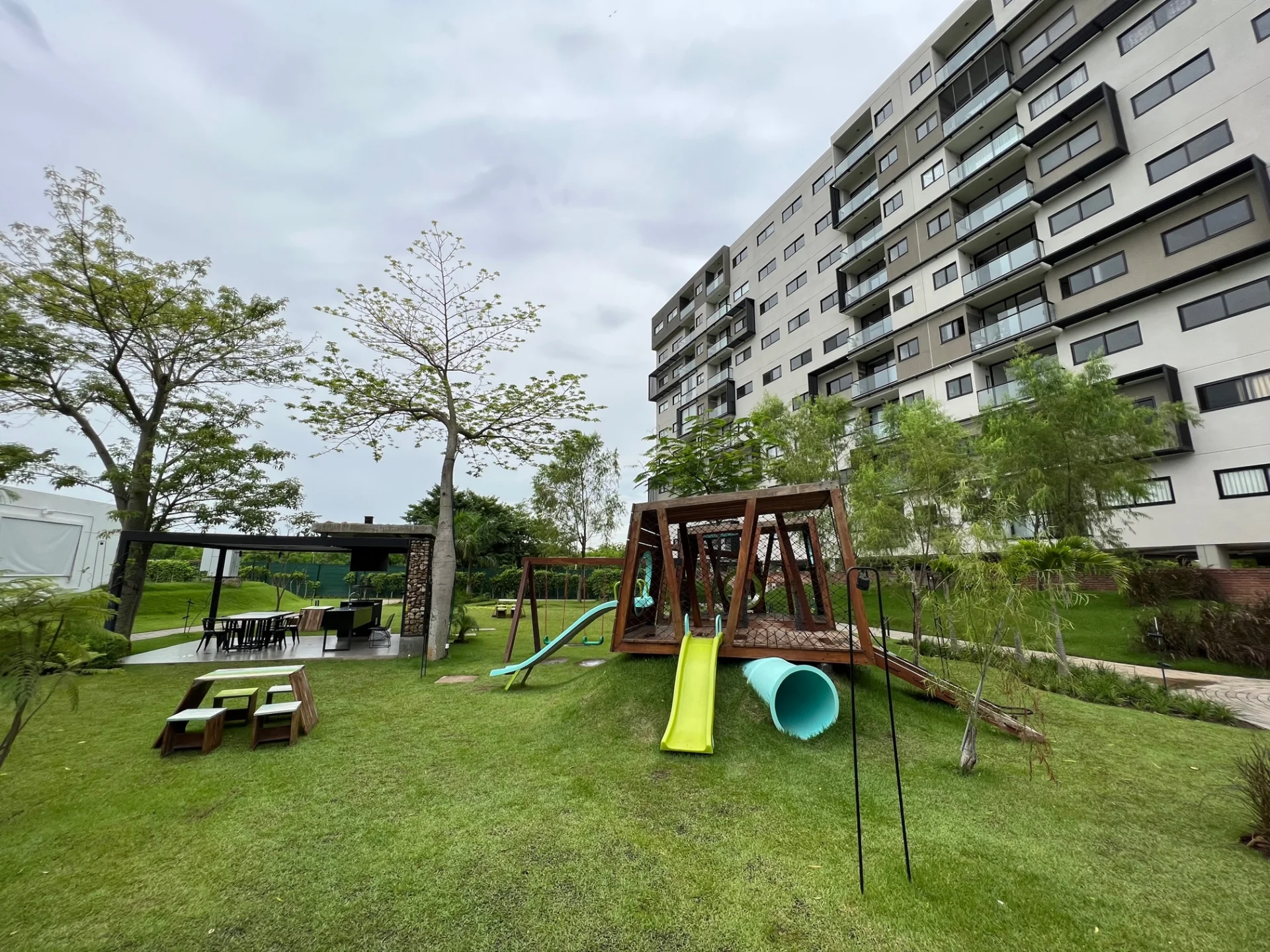 ===================================================================== - Condominio a estrenar, con guardia de seguridad 24 Hs. Cuenta con cámaras de seguridad, 1 ascensor Orona, 9 pisos, área social en planta baja con 3 churrasqueras, 1 piscina al aire libre, bella vegetación, parque infantil, cine al aire libre, sala social para eventos. Son hermosas sus áreas sociales y el condominio es pet friendly.