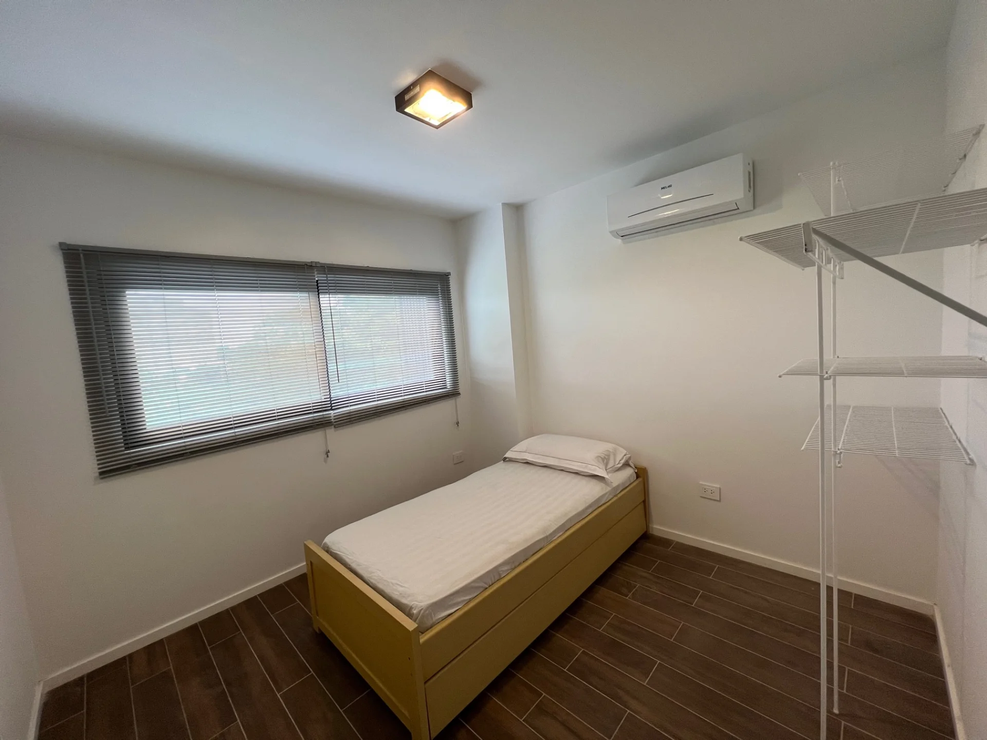 - 1 dormitorio equipado con aire acondicionado, rejilas, cortinas, cama de 1 plaza y media (cama doble).