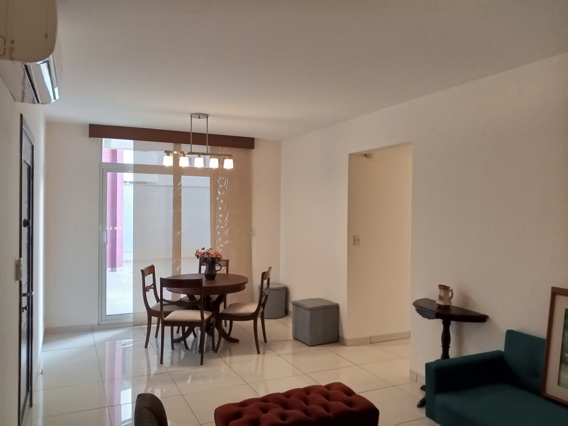 - Living comedor con acceso a amplia terraza, equipado con aire acondicionado, cortinas e intercomunicador.
