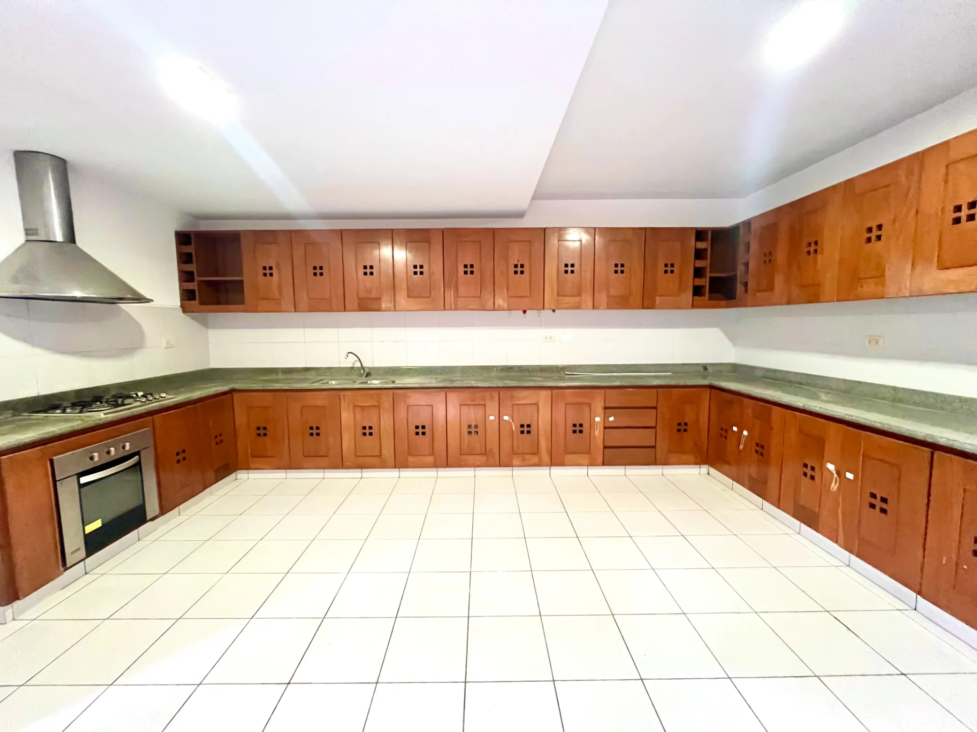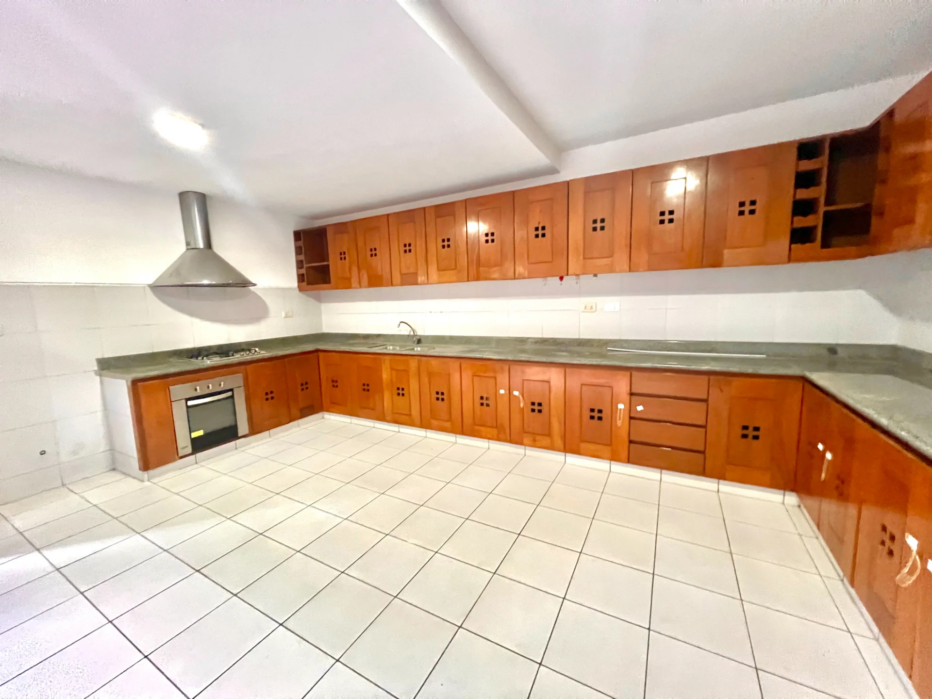- Cocina amoblada con muebles de madera altos y bajos, campana estractora de aire.