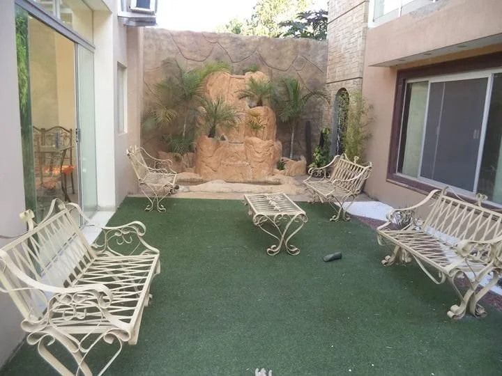 *Ground floor: Study, office, guest bathroom, dining room, living room, fully furnished kitchen with pantry, swimming pool, bathroom and shower, two waterfalls and garden, garage for 5 vehicles, storage room. For more information at ***