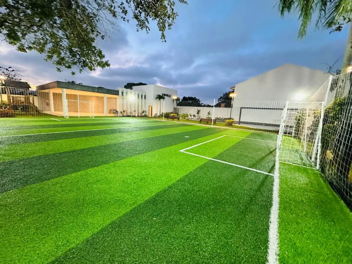 Churrasquera, Parque infantil, Cancha de pasto sintético, Poscina para adultos y niños.