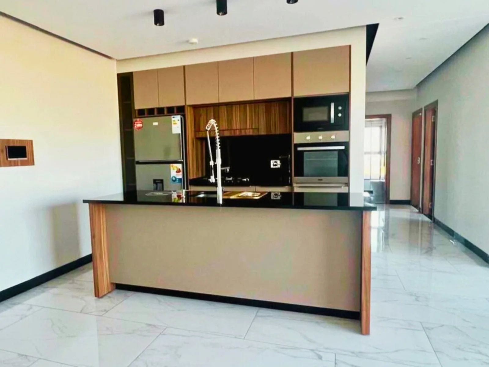 Granito negro chiquitano en todos los mesones, mobiliario de piso a techo, cocina a gas de 5 hornallas, horno eléctrico, microondas y refrigerador incluidos.