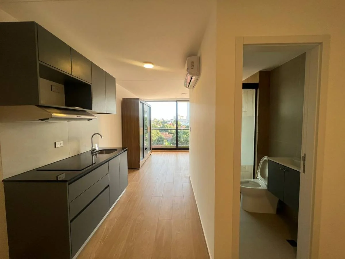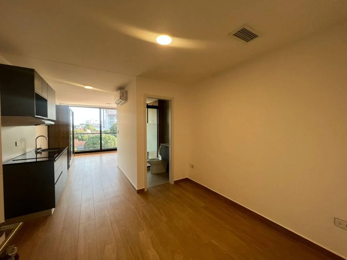 Cuenta con: cortina, aire,calefon, baño completo y cocina equipada, BALCÓN.