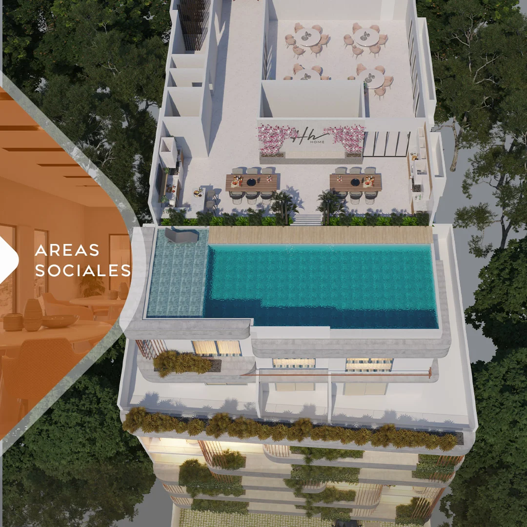 Áreas sociales en el último nivel: Piscina, bar, churrasqueras, co-work con sala de reuniones.
