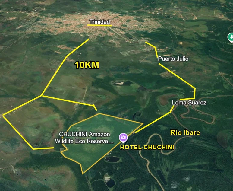 A 10km al nor-oeste de Trinidad, pasando Puerto julio y loma Suárez por el camino a hotel eco resort Chuchini. La propiedas está al lado de hotel Chuchini.