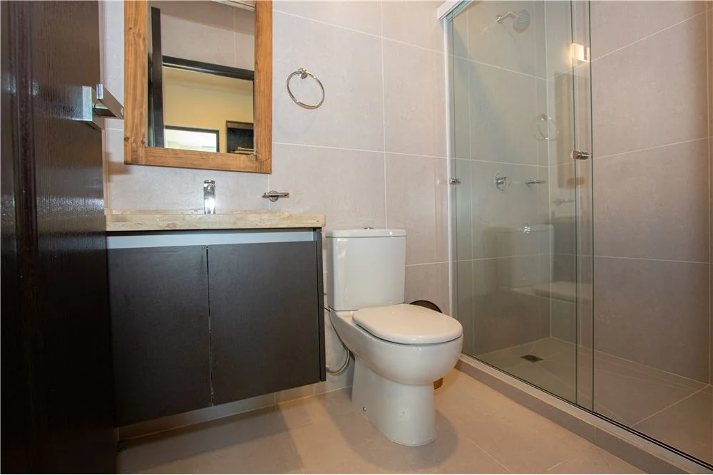 -Baño compartido con box de ducha y repisa de vidrio.