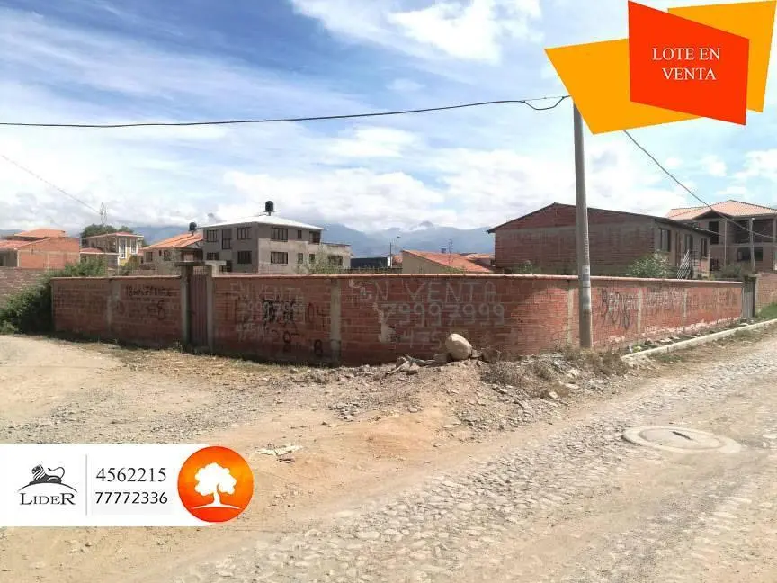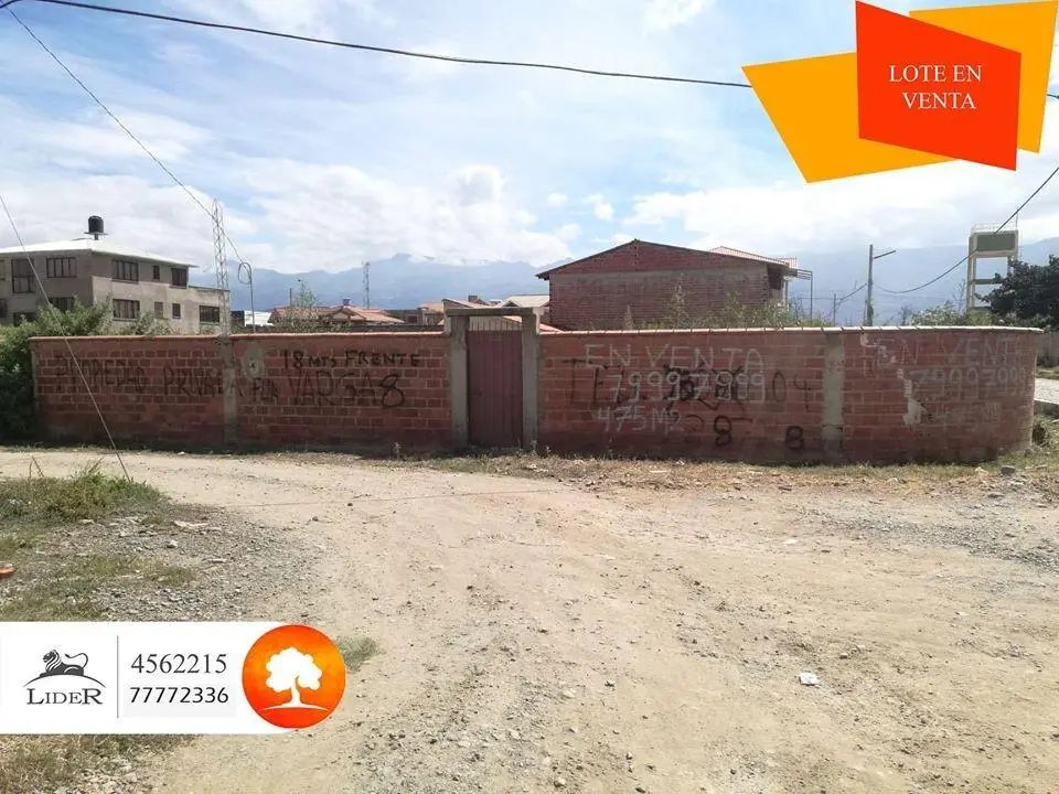 SUPERFICIE: 475 M2 FRETE: 18M2 AL SUD - 26 M2 AL ESTE CBBA (SE ACEPTA FINANCIAMIENTO) AMPLIO LOTE EN ESQUINA AMURALLADO PRÓXIMO VÍCTOR USTARIZ KM 6 1/2, A UNA CUADRA DE LAS RIELES, PASARA EL TREN METROPOLITANO, transporte público, se pago 1500$ por la acción de agua, 1000$ por el alcantarillado, tiene medidor de luz, garzonier pequeño dentro el lote, próximo a farmacia, cancha de fútbol, área verde, parque infantil, zona en pleno crecimiento con chalet nuevos, papeles al día