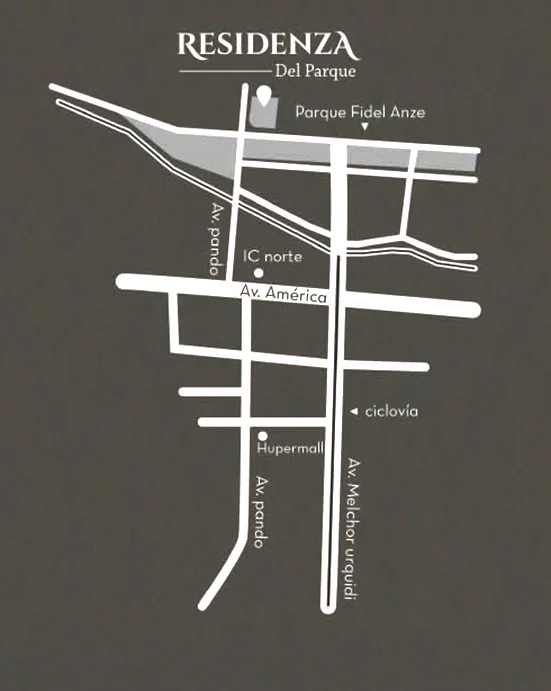 Residenza del Parque se ubica en una de las zonas residenciales más privilegiadas de la ciudad: Av. Pando esquina David Alvéstegui, frente al Parque Fidel Anze. Cerca de supermercados, restaurantes, centros comerciales, universidades, colegios, ciclovía, hermosos parques y áreas verdes.