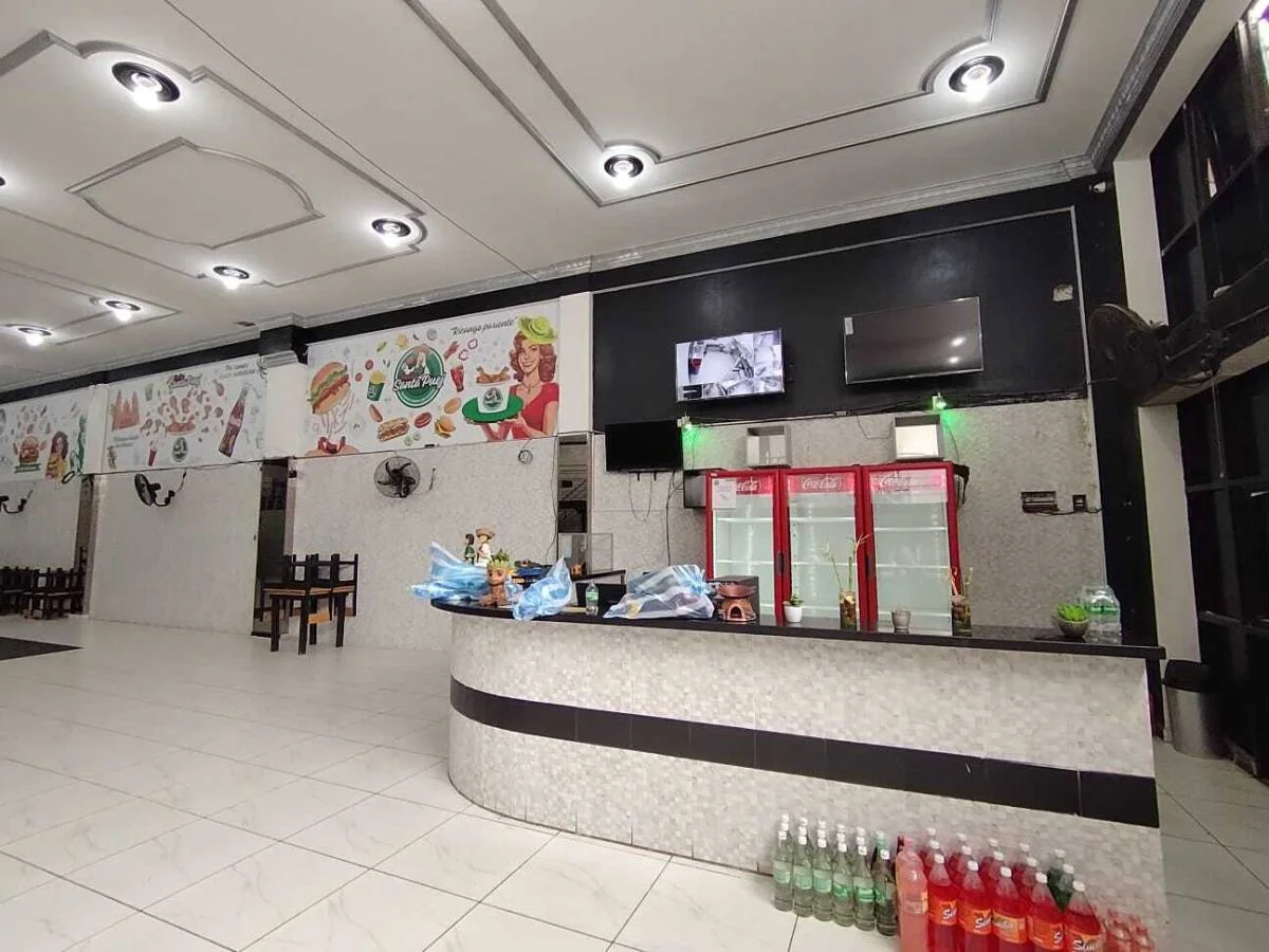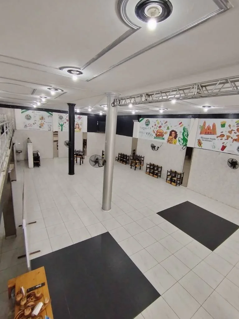 Planta baja: Cocina con campana y extractor eólico, áreas de cajas, amplio salón con balcón interior, baños para caballeros y damas