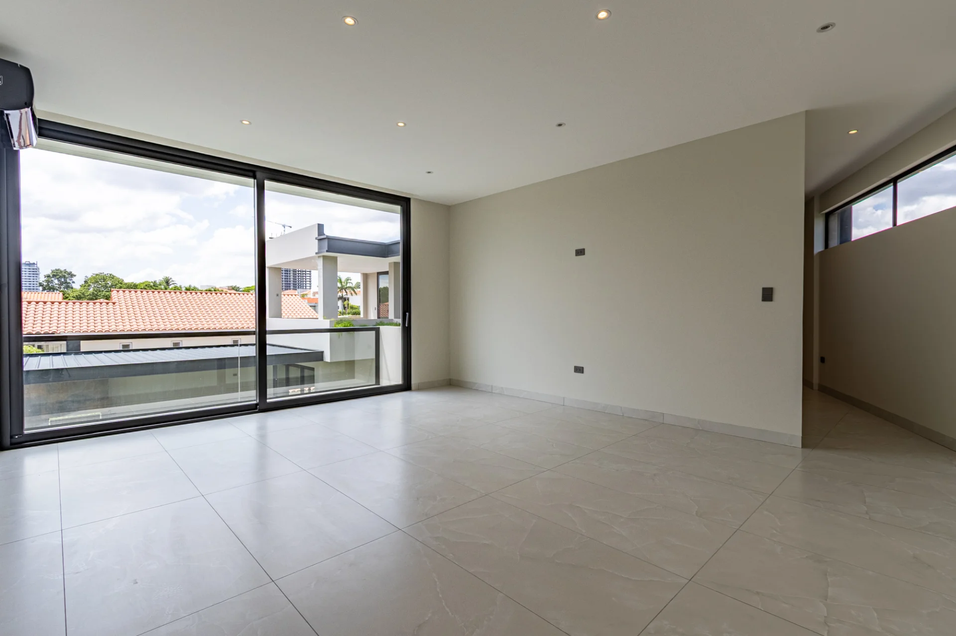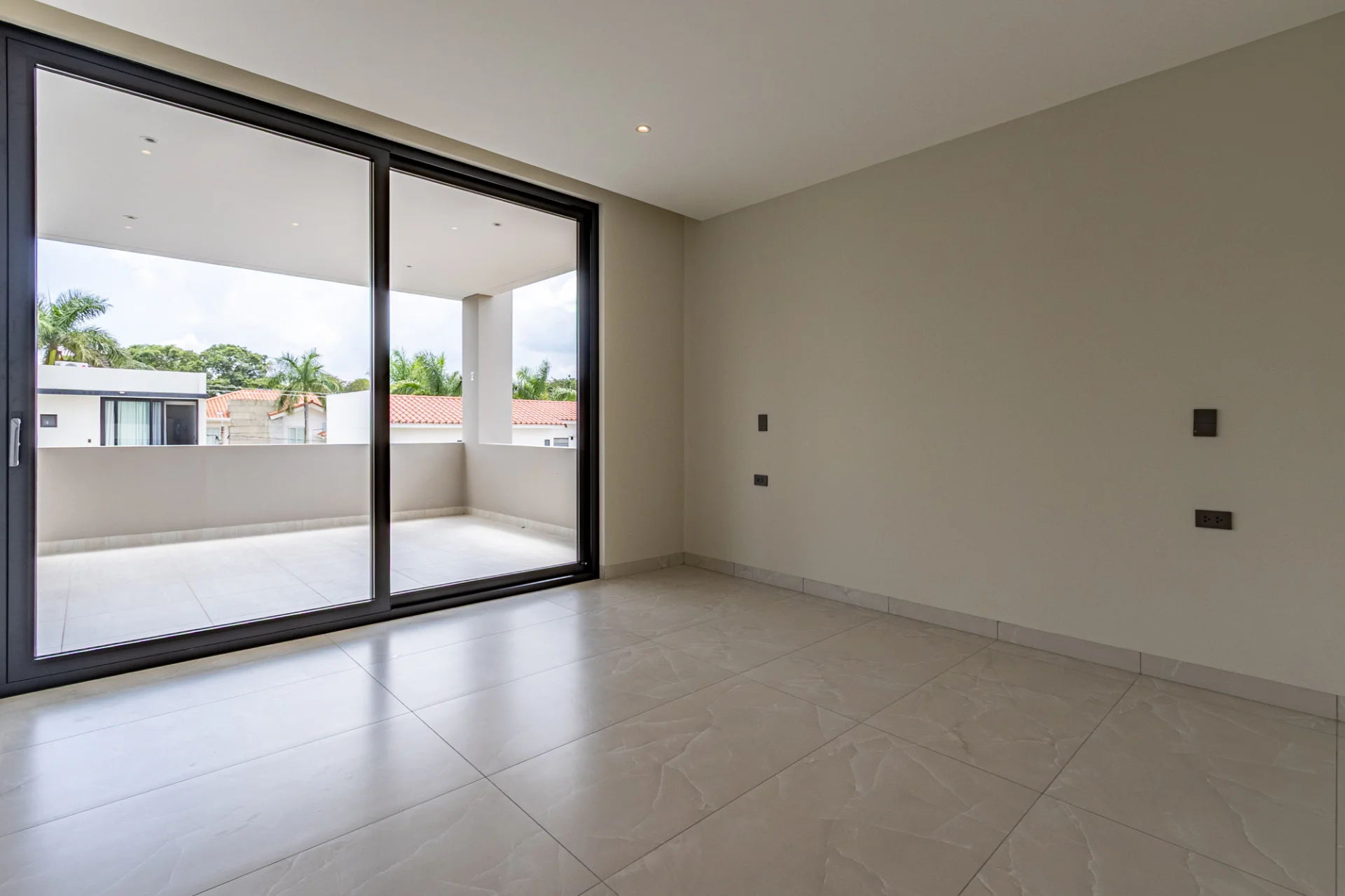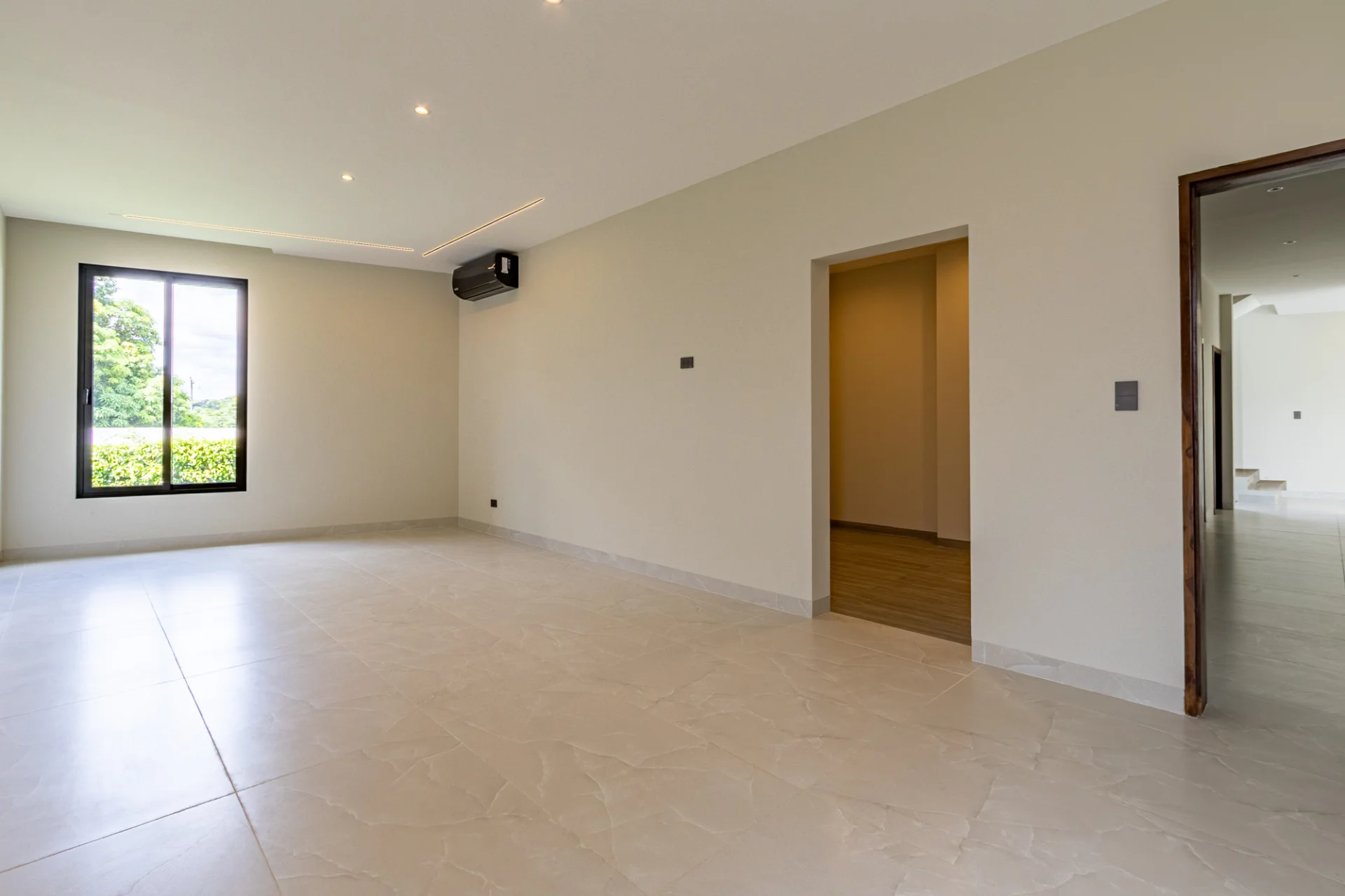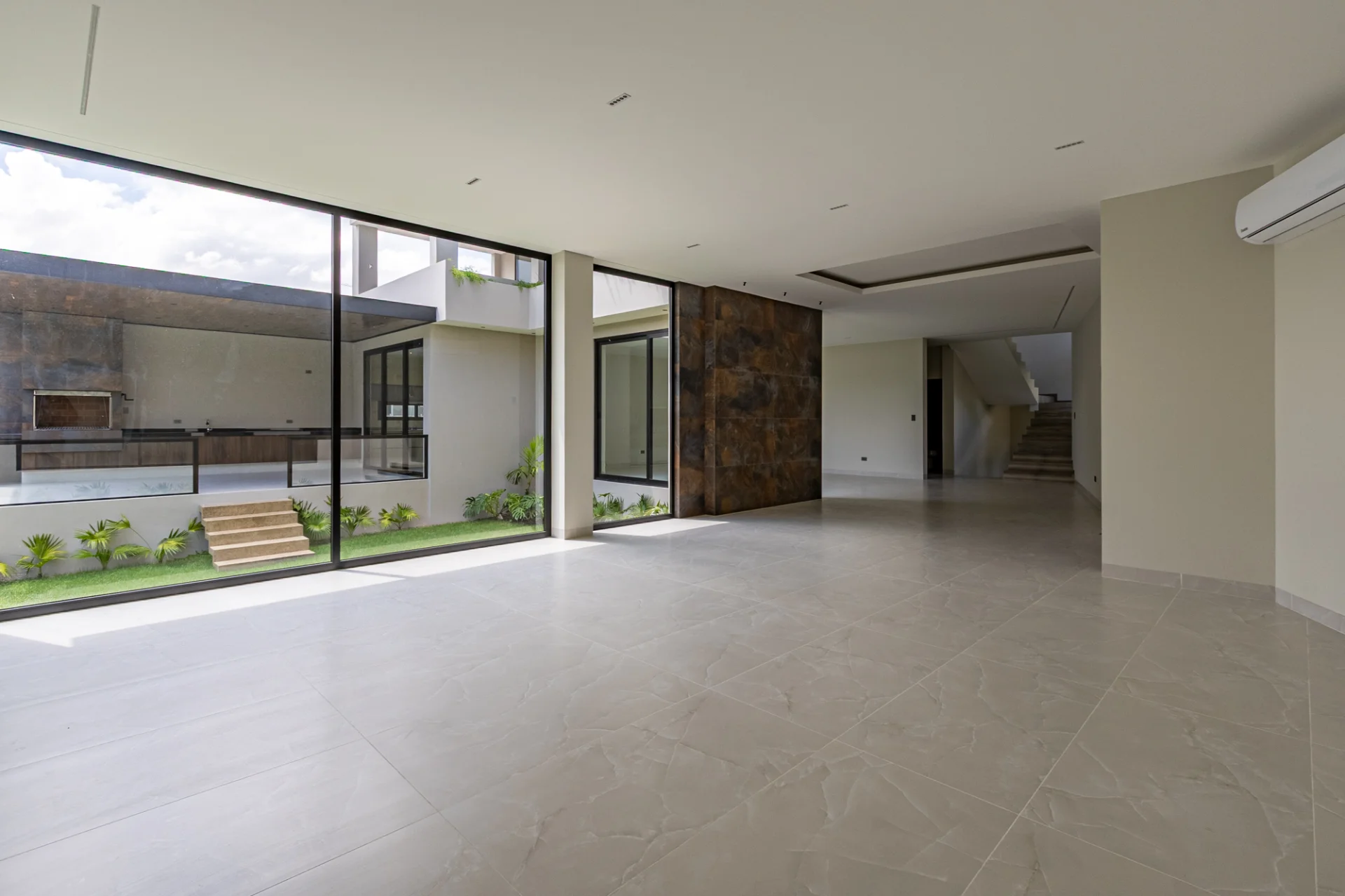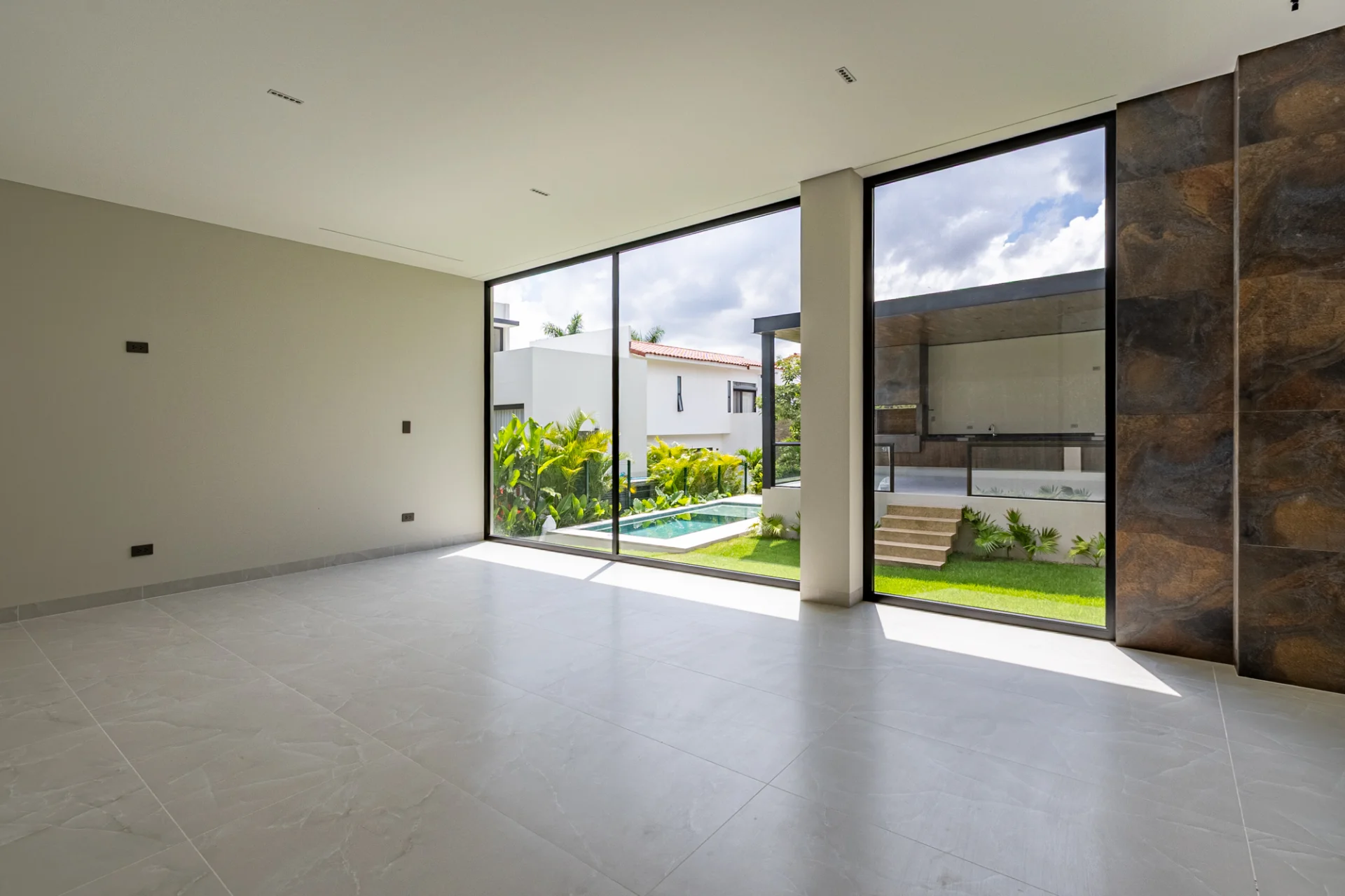 La sala principal, ubicada a la izquierda, tiene vista al jardín, la churrasquera y la piscina, creando un ambiente perfecto para disfrutar y recibir invitados.