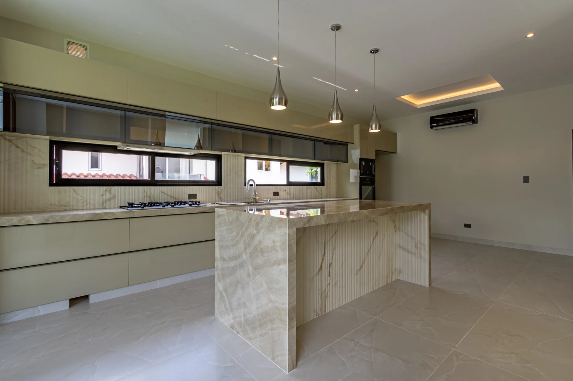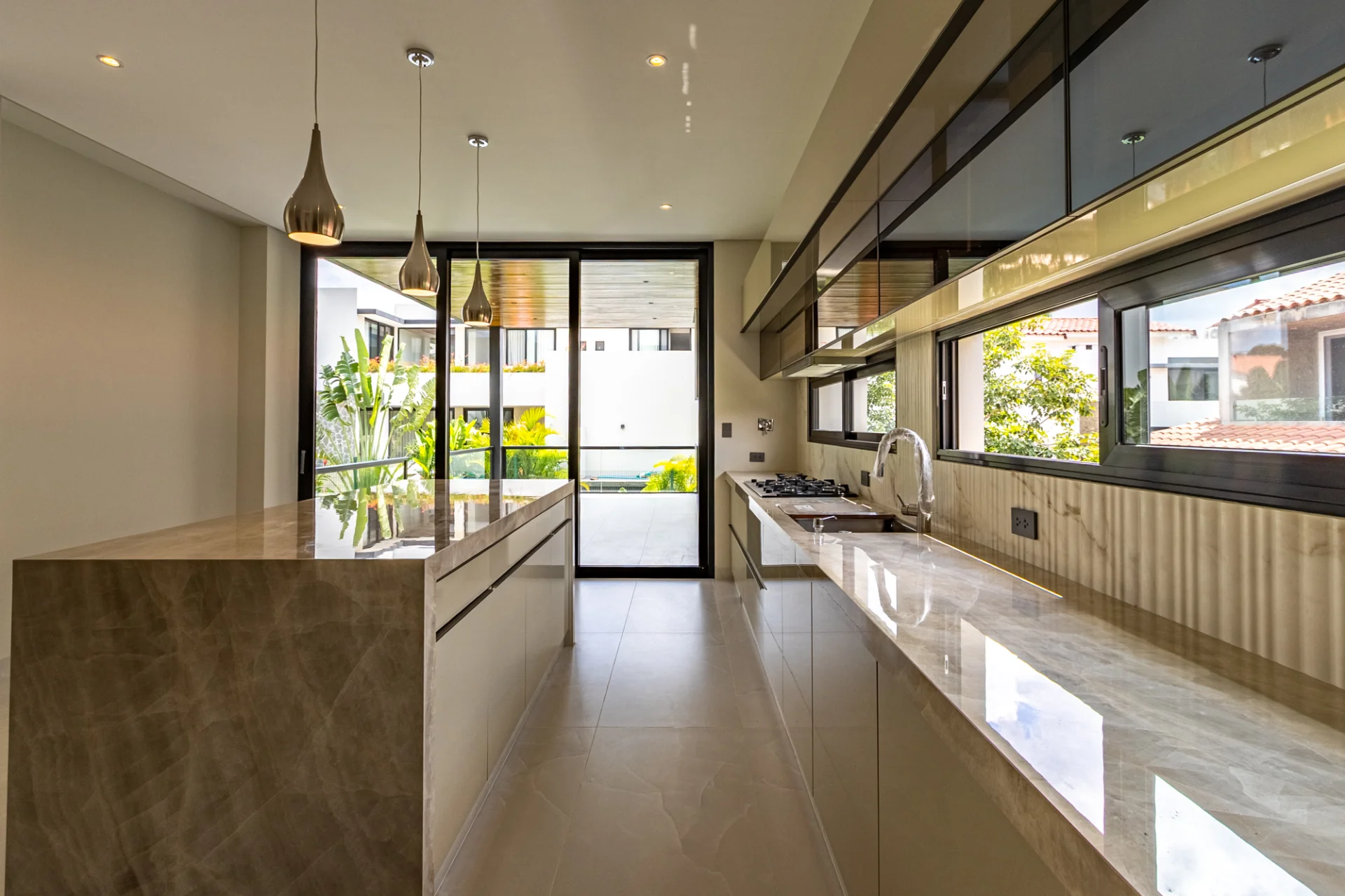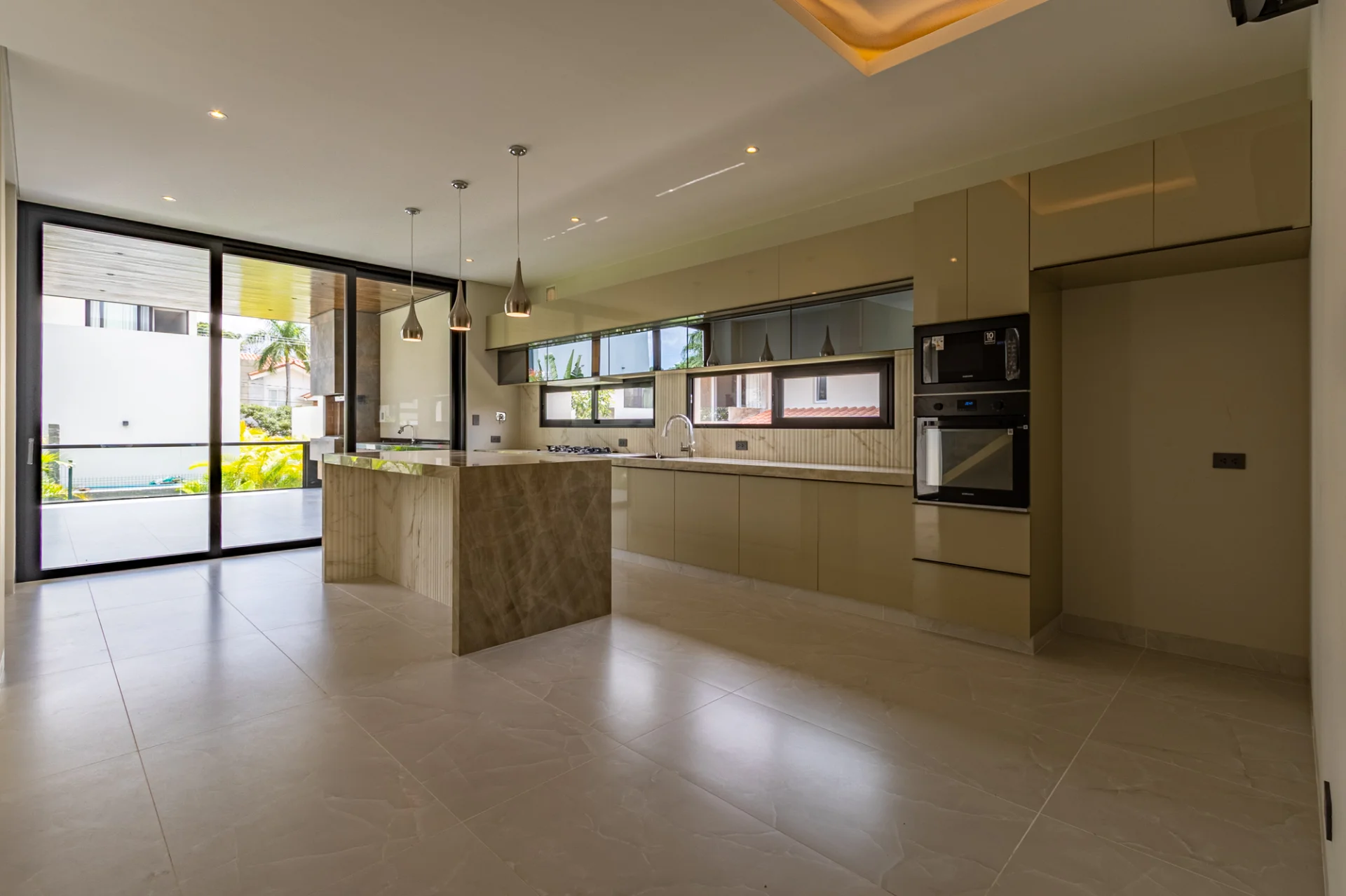 El comedor es amplio, con ventanales de piso a techo que permiten el ingreso de abundante luz natural, y se integra a la cocina con acabados en tonos neutros y material de alta gama.