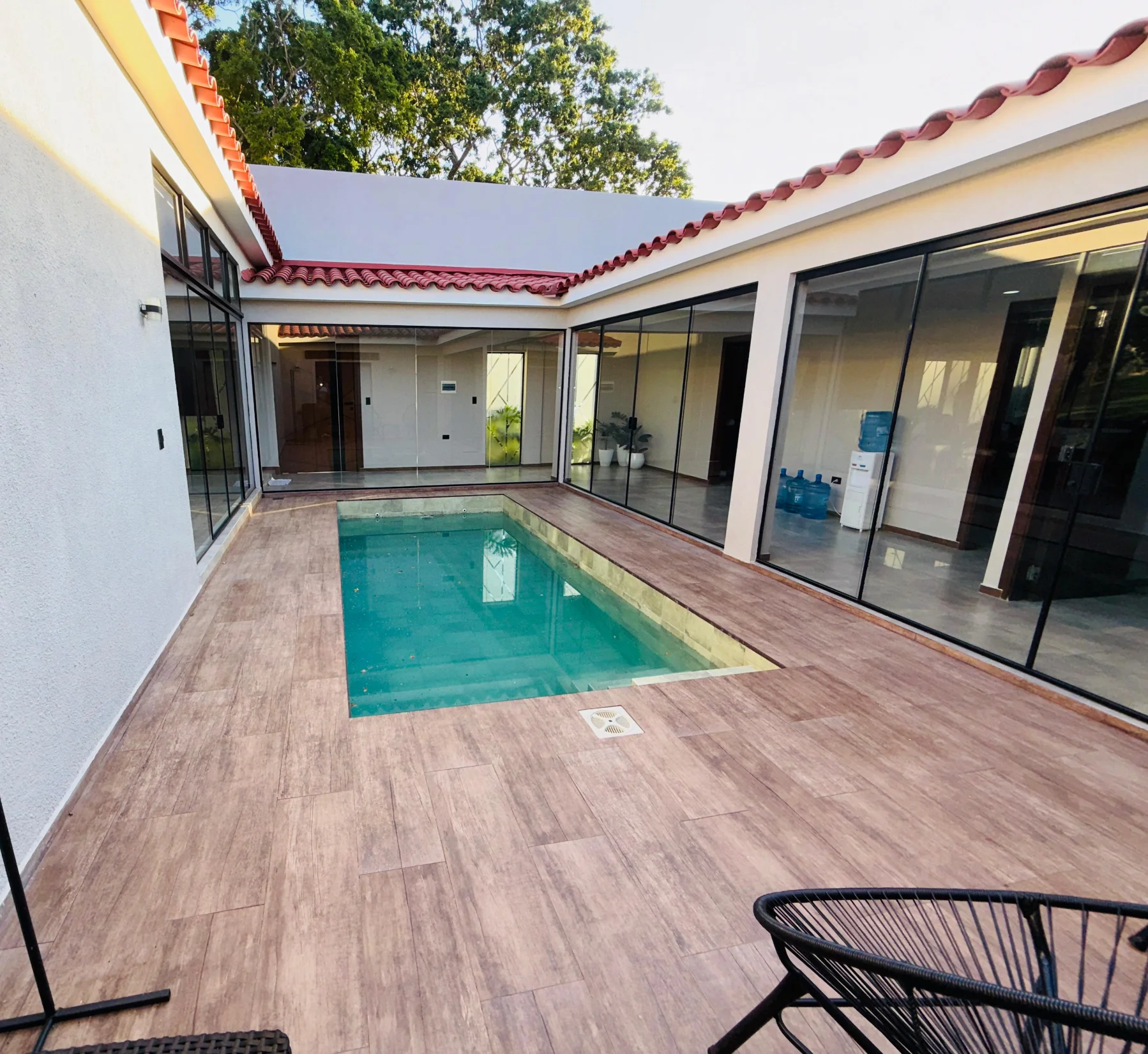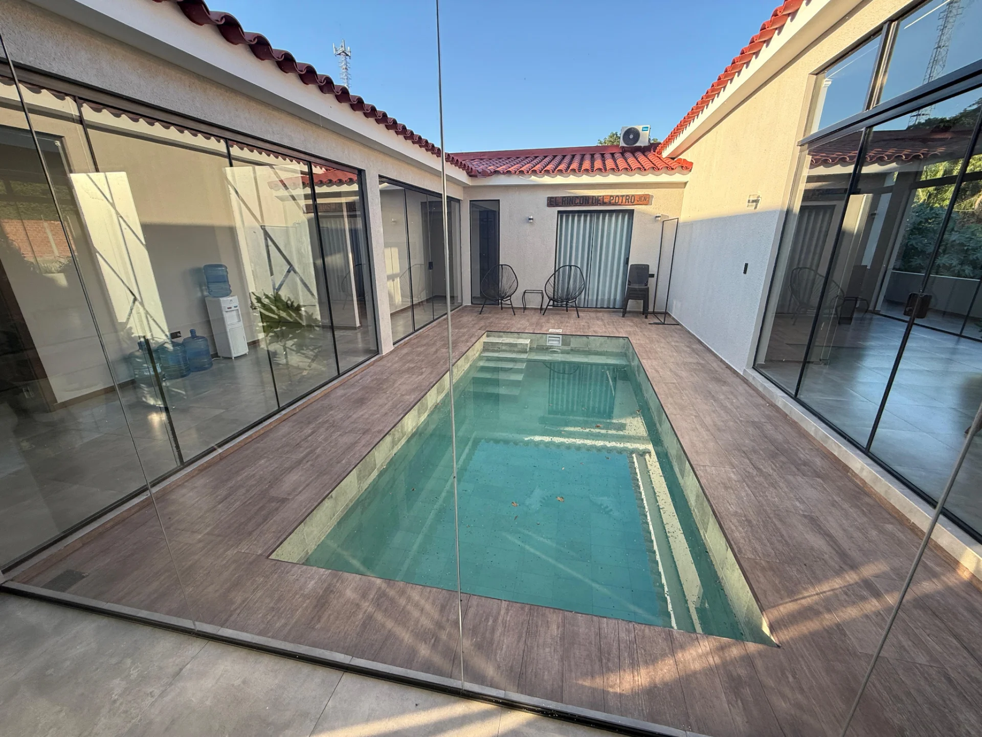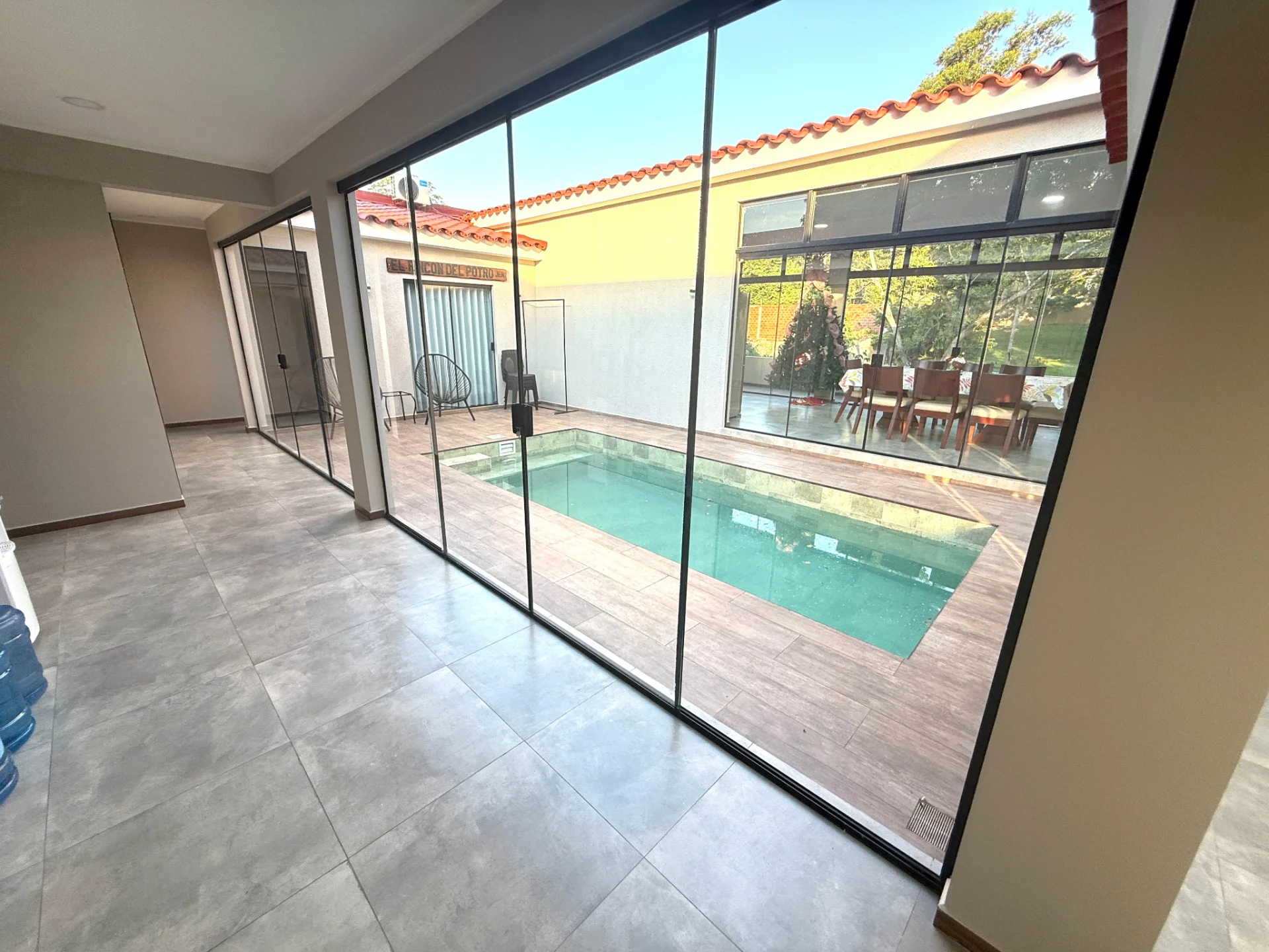 Características .- 4 habitaciones (1 suite), baño a compartir, living comedor, cocina integrada, patio central, patio lateral, garaje para 3 vehículos, piscina propia y churrasquera.