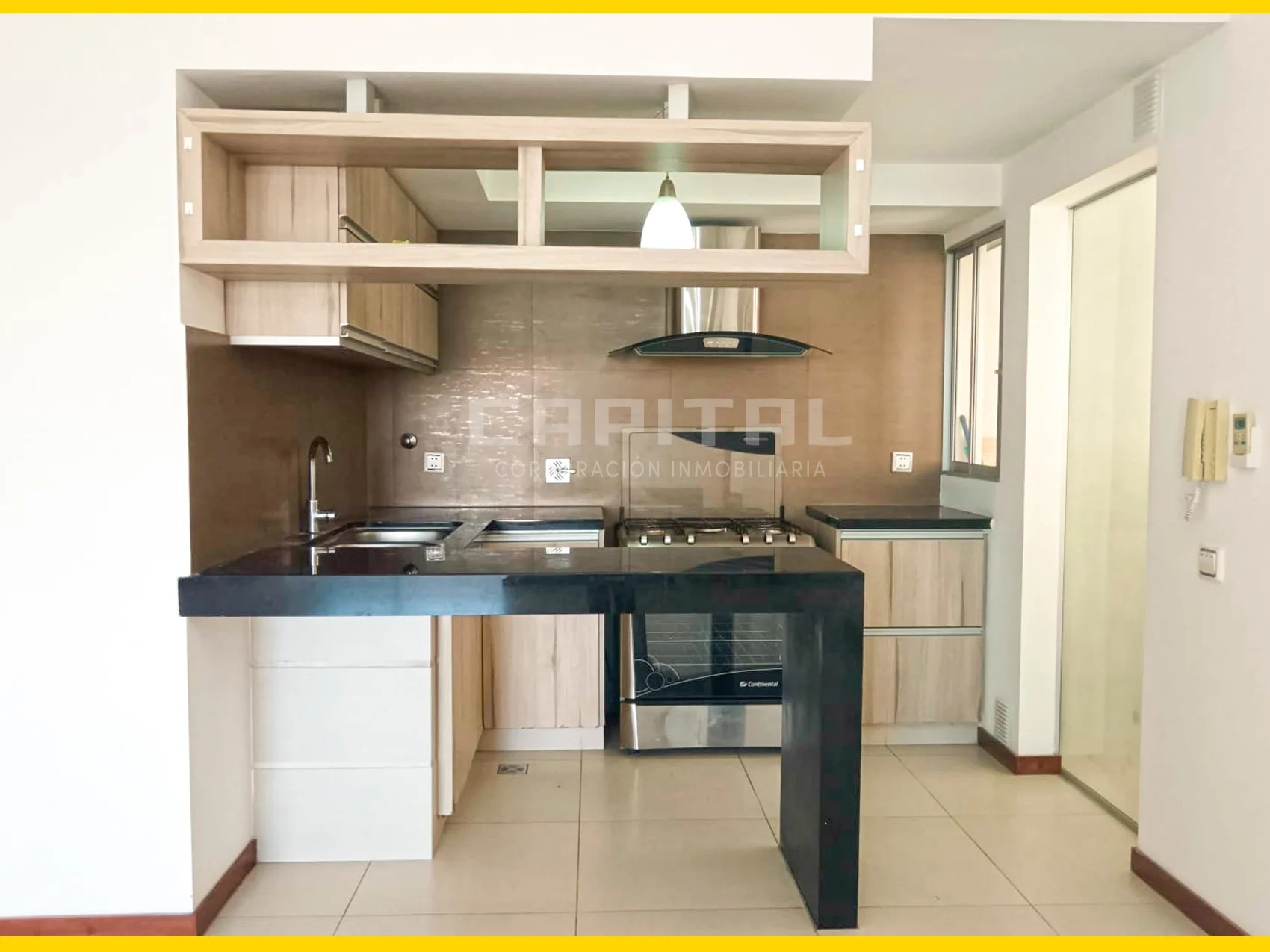 ✅ Moderna cocina americana equipada con muebles altos y bajos, cocina, horno y refrigerador ????????