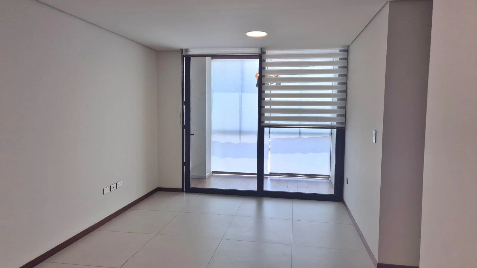 Balcón con ventanal hasta techo y piso con revestimiento de color madera