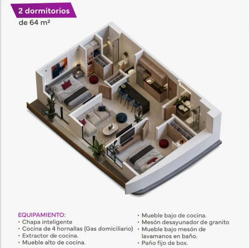 y Departamentos de 1 y 2 Dormitorios.      MODERNO EQUIPAMIENTO que incluye: Cocina, extractora, muebles altos y bajos de cocina, mueble y paño fijo de box en baño.                         Áreas de Comunidad