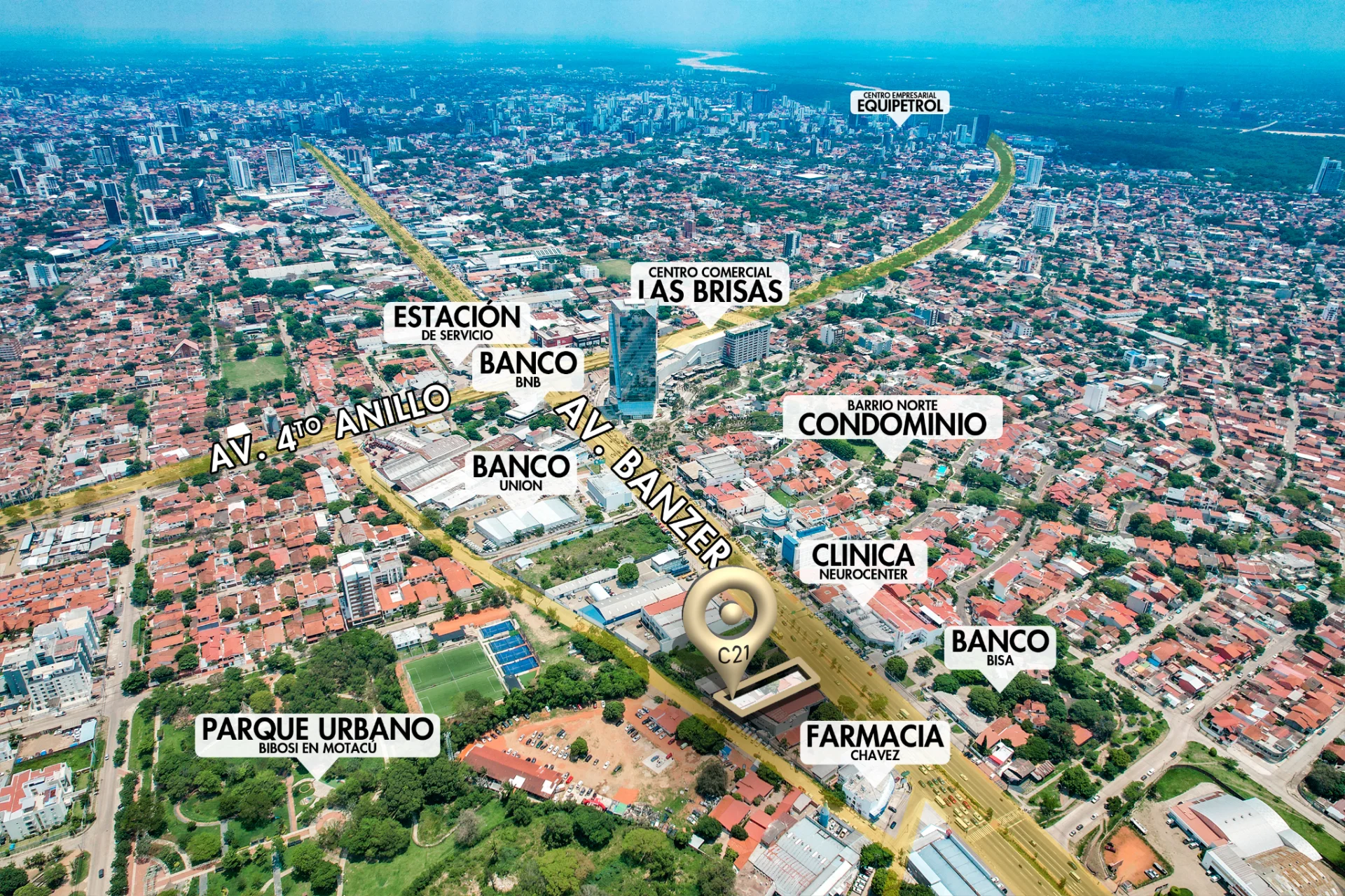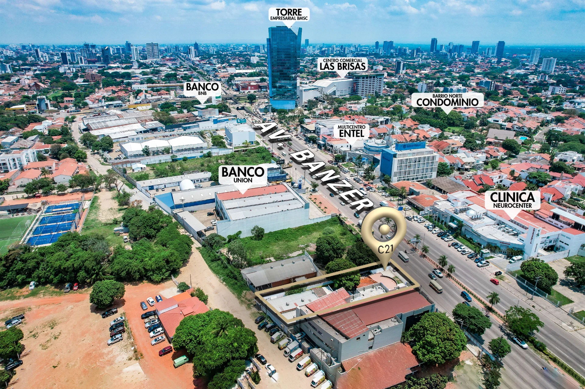A pocos metros del Centro Comercial LAS BRISAS, Torre BMSC, Banco BNB, Banco UNIÓN, Banco BISA, ENTEL, TUMPAR, Farmacias Chávez, Amarket, Farmacorp, Clínica Neurocenter, empresas de AgroNegocios, empresas automotrices, entre otros.