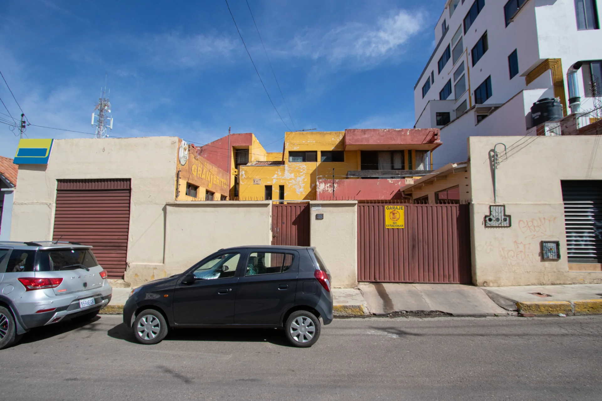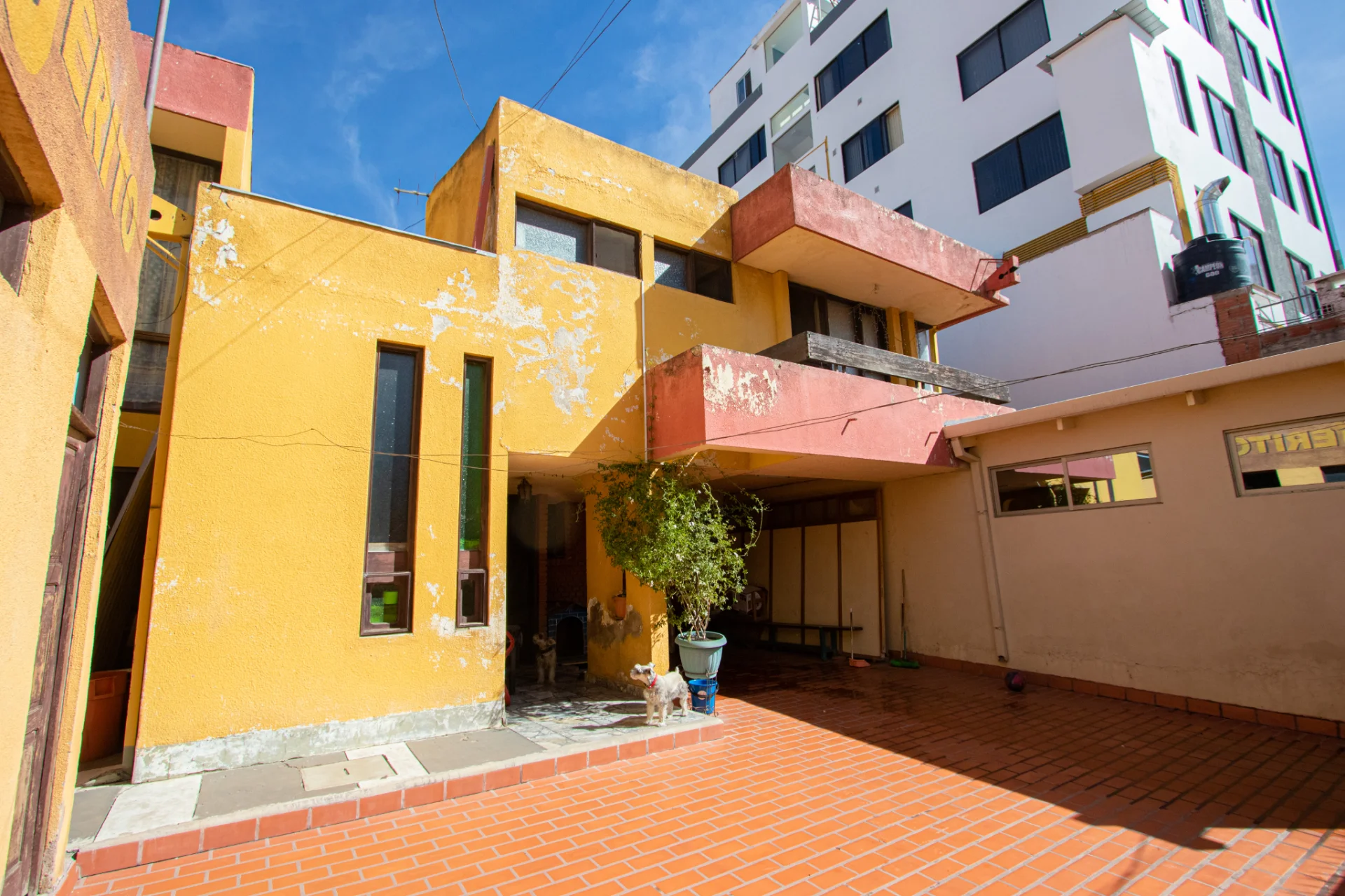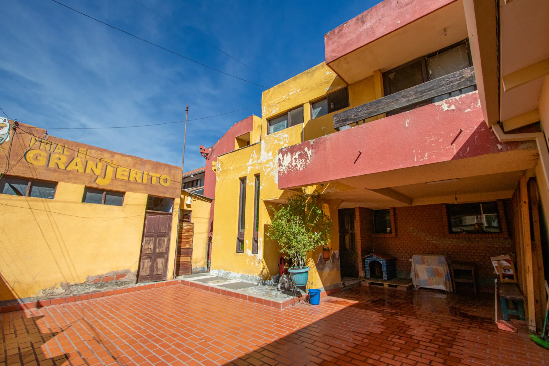 Hacia la calle dos tiendas comerciales y en el fondo un galpon que actualmente funciona como escuela de danza