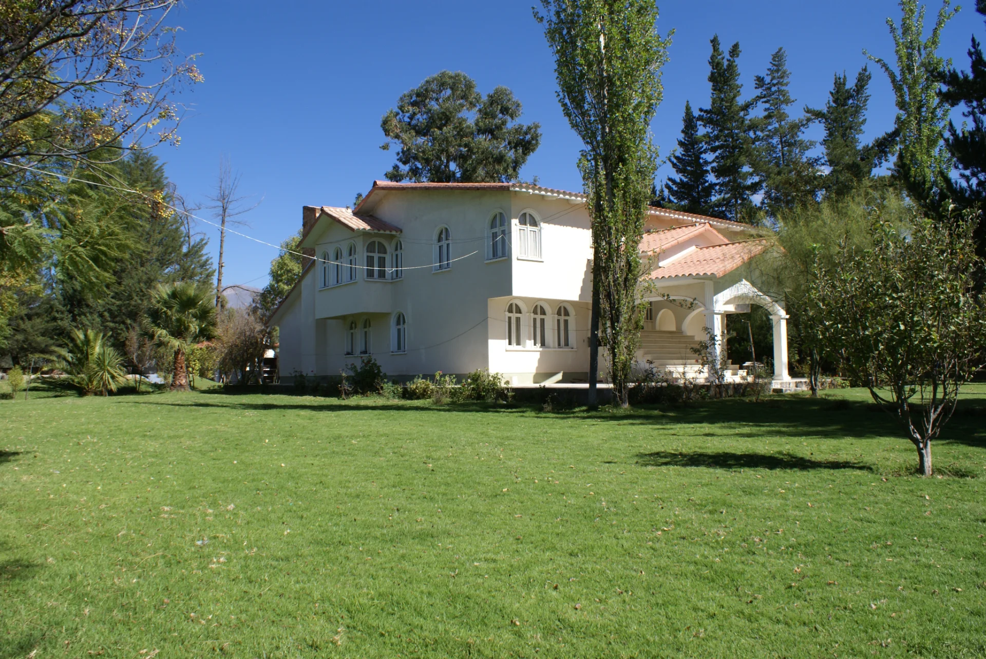 Hermosa casa de campo, construida en dos plantas, tipo colonial. Planta baja: amplio living- comedor con piso de mármol; cocina, comedor de diario, escritorio, gradas de mármol. Planta alta: dormitorios, amplia sala de estar, todo alfombrado; baños con box de ducha. Puertas de madera mara laqueada; roperos empotrados de madera mara laqueada. Piscina con baños damas y varones, parrillero, ambientes auxiliares techados, capilla, amplios jardines con árboles ornamentales y algunos frutales. Pozo de agua a 100 m con bomba.