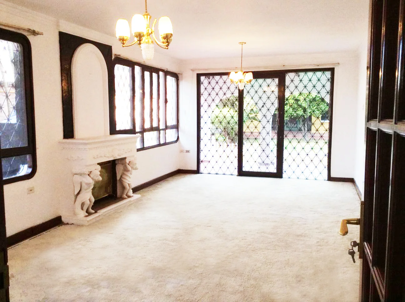 Planta Baja: Hall de recepción, living comedor alfombrado con chimenea, amplios ventanales y puertas con accesos al jardín, cocina amplia con cajonería completa y despensa, comedor diario, estar familiar, escritorio, 1 baño de visitas.
