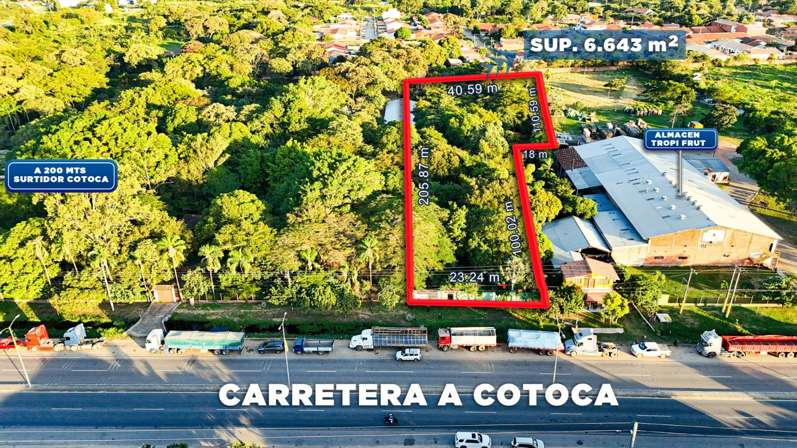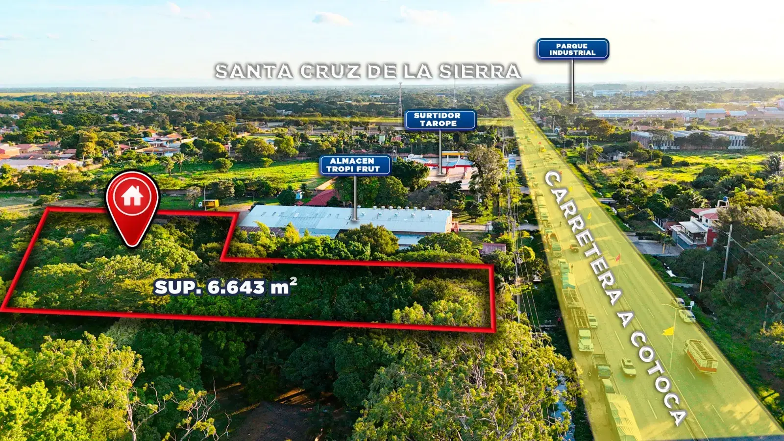 Ubicado a solo una cuadra antes del cartel “Bienvenidos a Cotoca”, junto a la embotelladora Tropi Frut. Zona de alto tránsito, ideal para desarrollo comercial o industrial.
