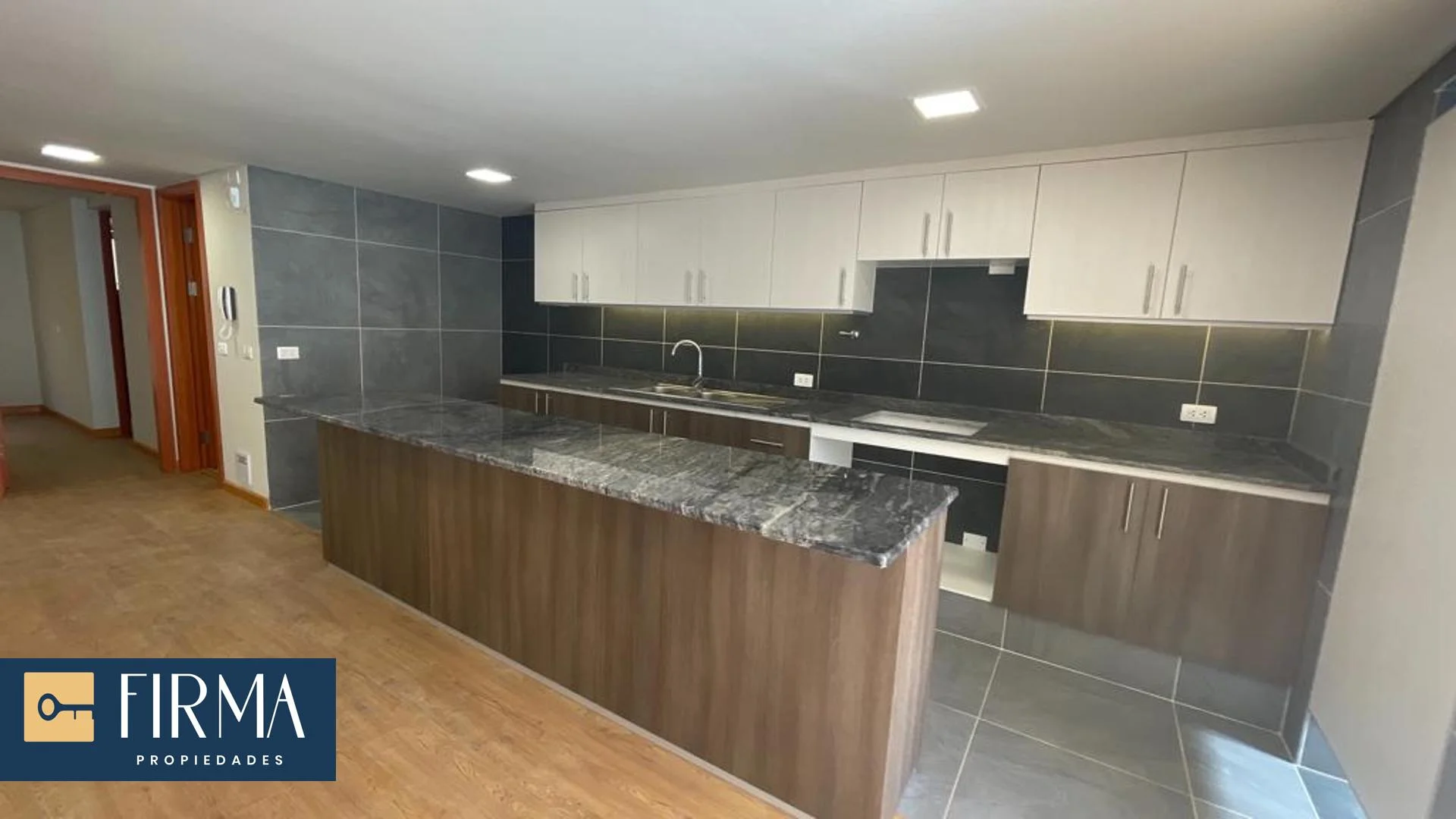 -Cocina con mueblería alta y baja y mesones de granito, estilo americana