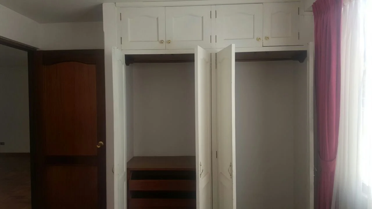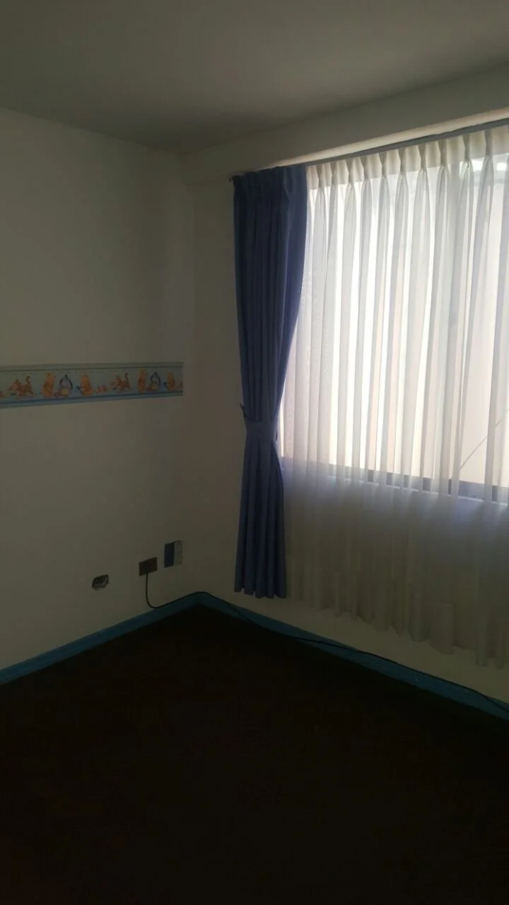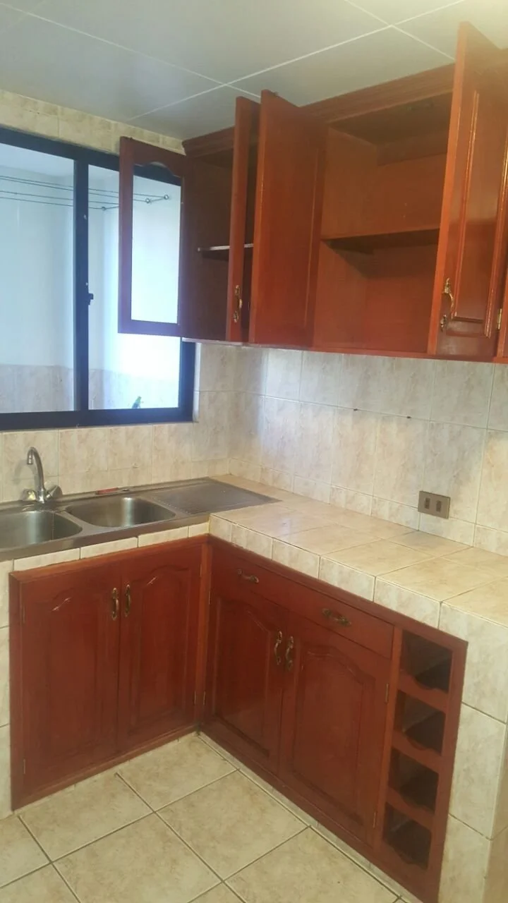 Departamento de tres dormitorios todos con roperos empotrados y alfombrados, uno en suite con baño privado y tina, cocina y baño con muebles, un pequeño cuarto de escritorio y lavandería, incluye cortinas y lámparas. No cuenta con parqueo ni baulera. Se acepta financiamiento bancario.