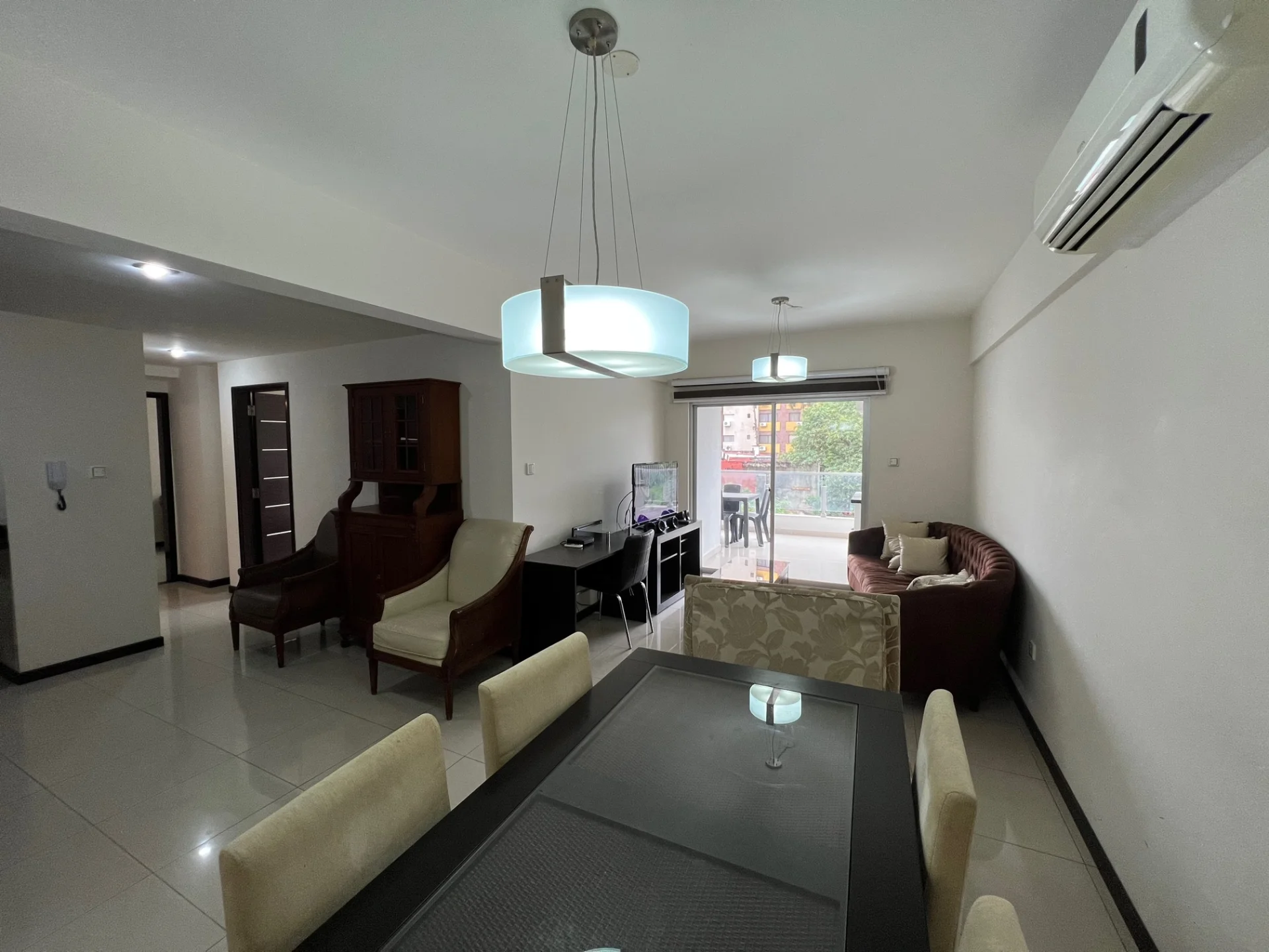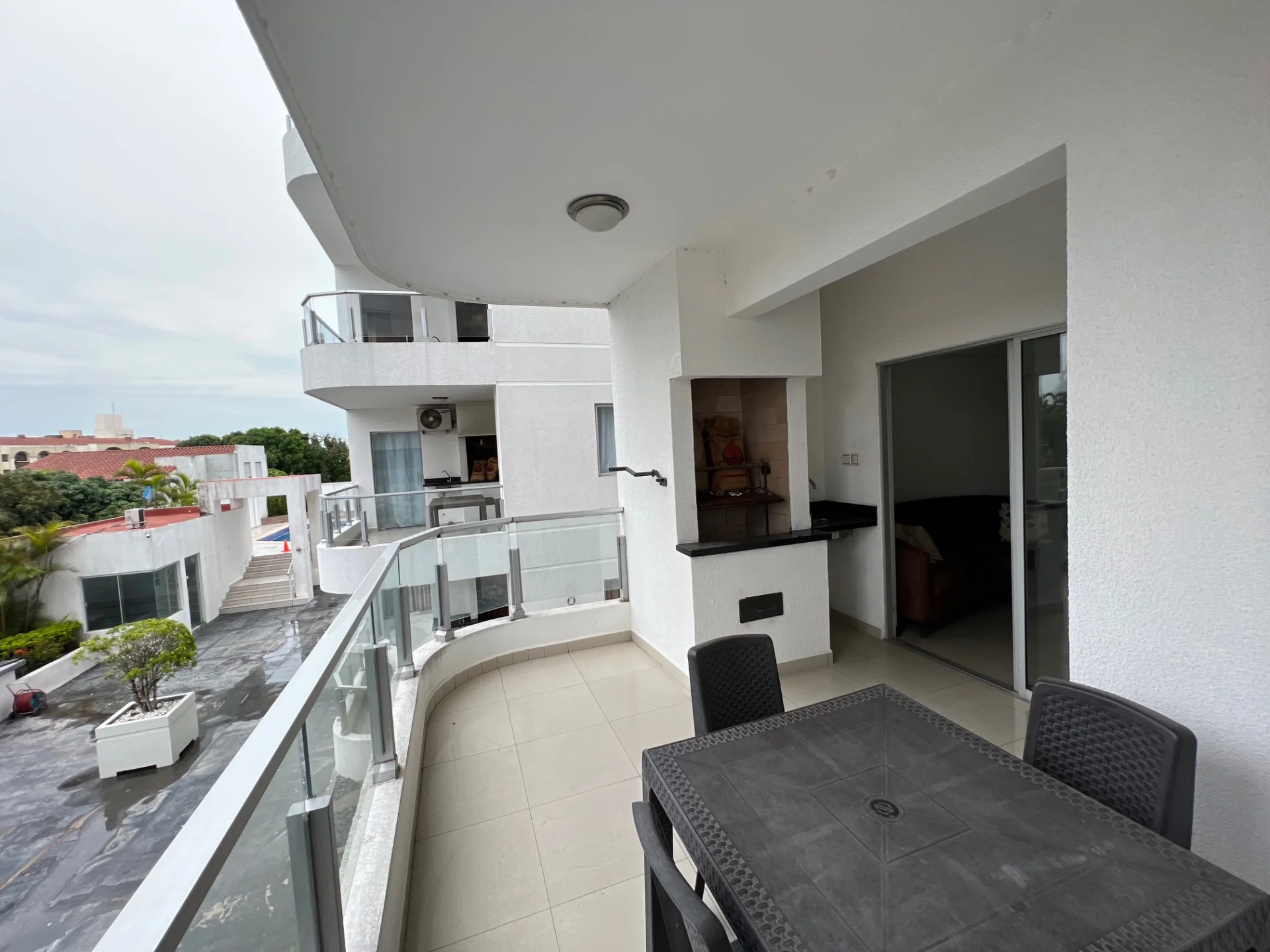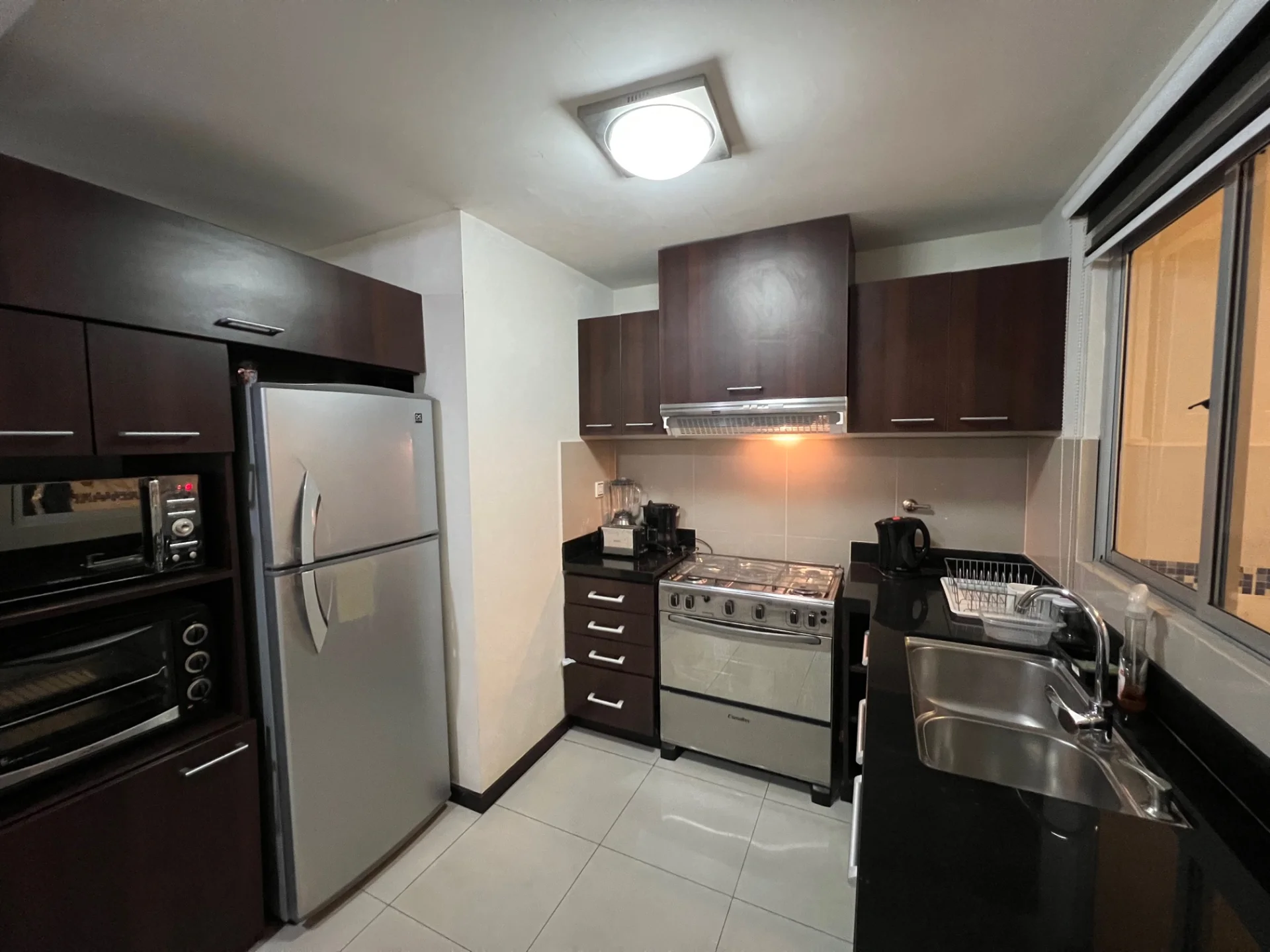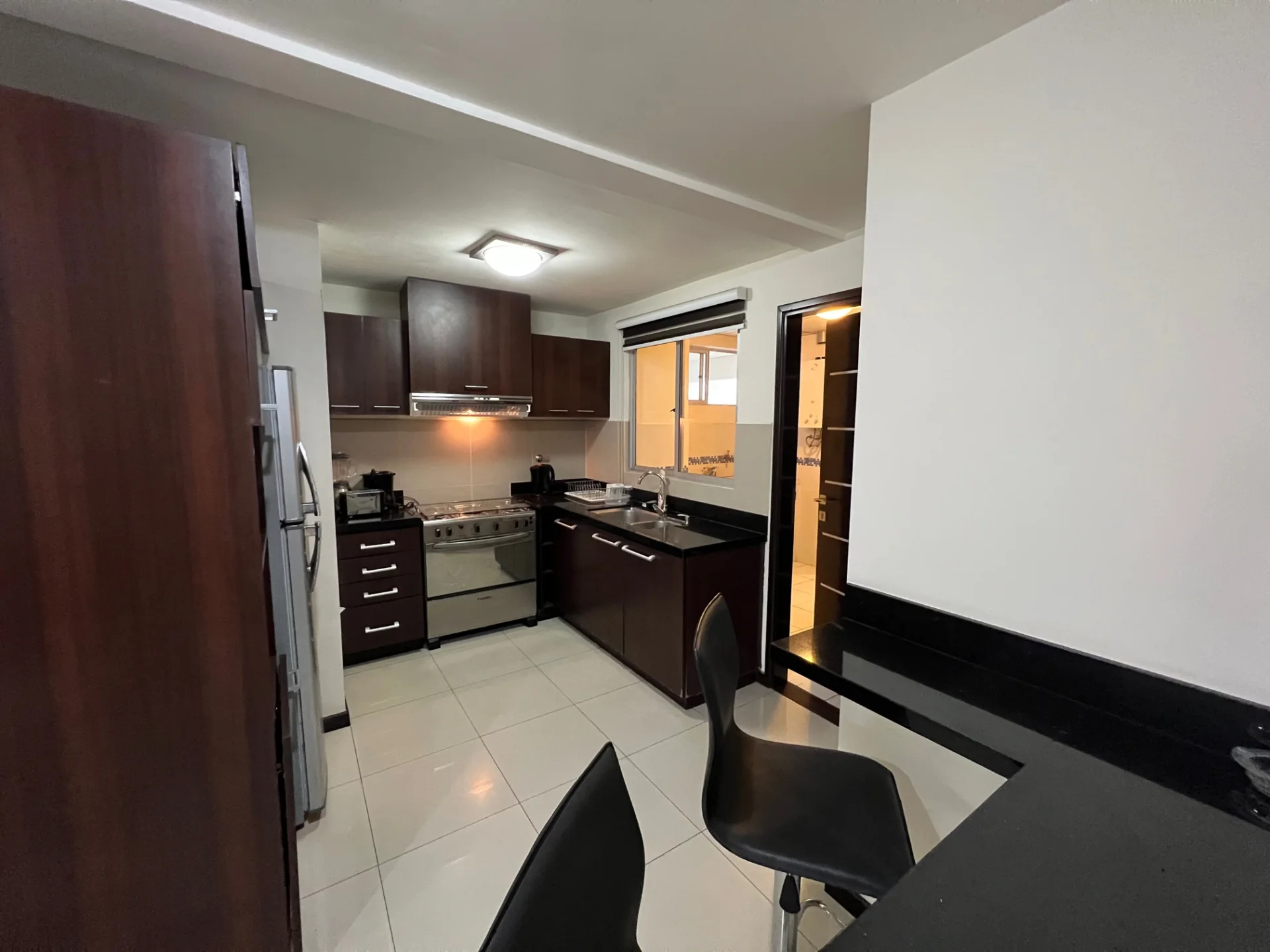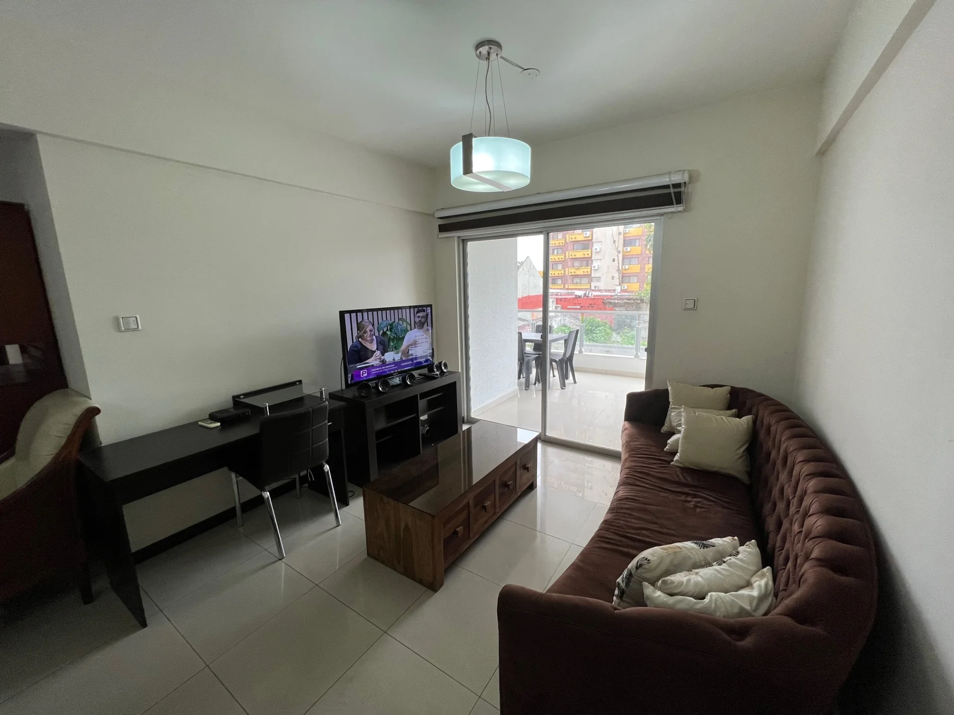 - Living cocina comedor integrado equipado con aire acondicionado, TV Sony 42 pulgadas, mesa para trabajar en laptop y cortinas, con acceso a balcón con churrasquera, cocina equipada con muebles de cocina superior e inferior, cocina de 5 hornallas, extractor, heladera Daewoo, microondas Daewoo, horno eléctrico Magefesa, desayunador en isla.