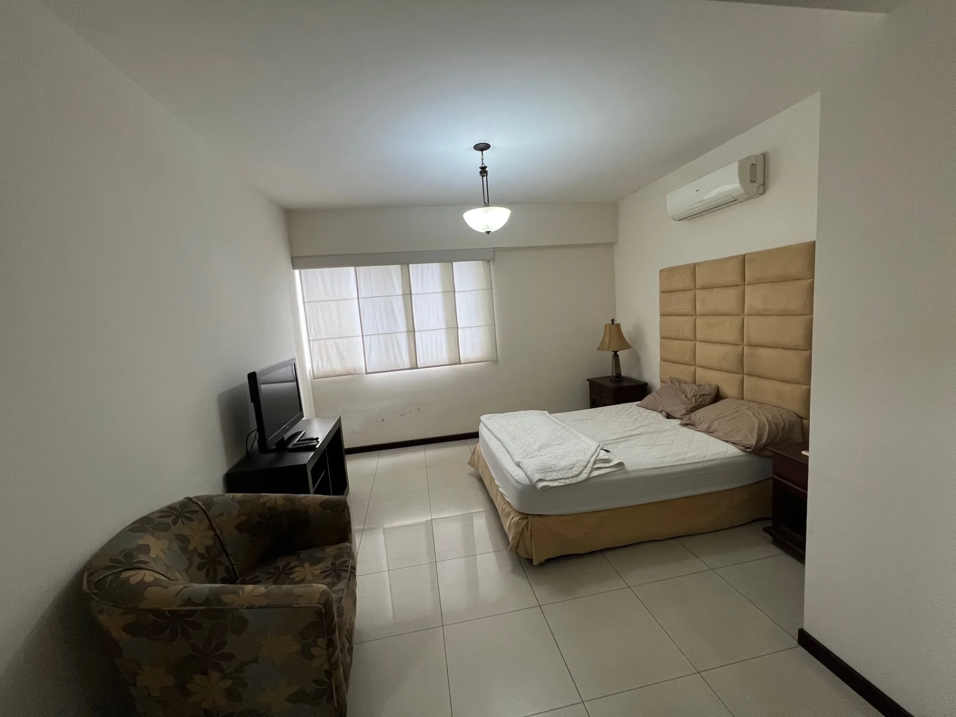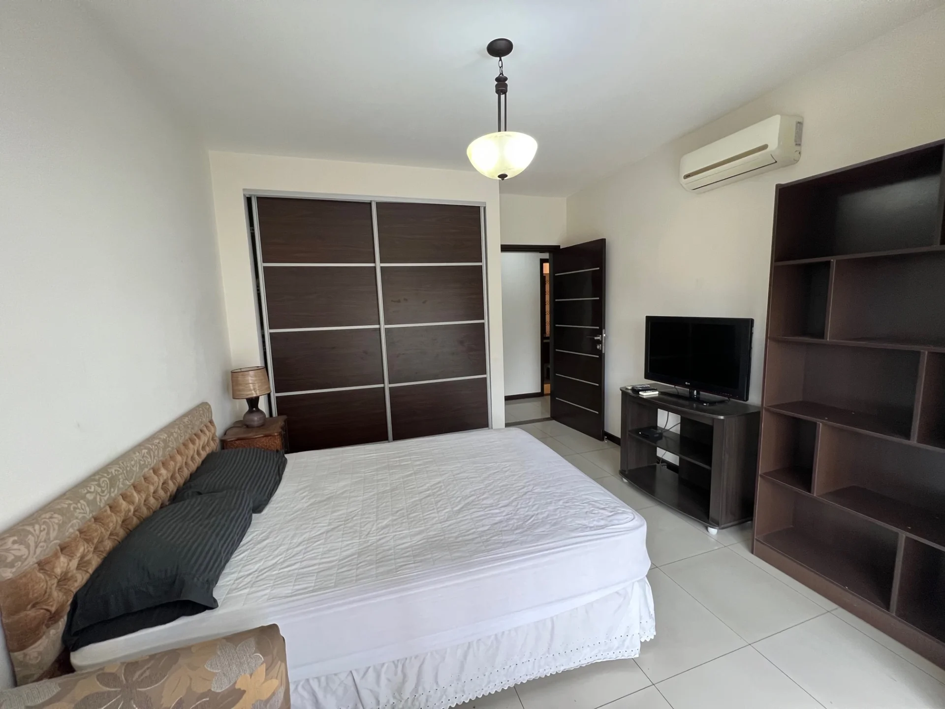 - 1 dormitorio equipado con cama de 2 plazas, ropero empotrado, aire acondicionado, TV LG de 32 pulgadas, con acceso a balcón.