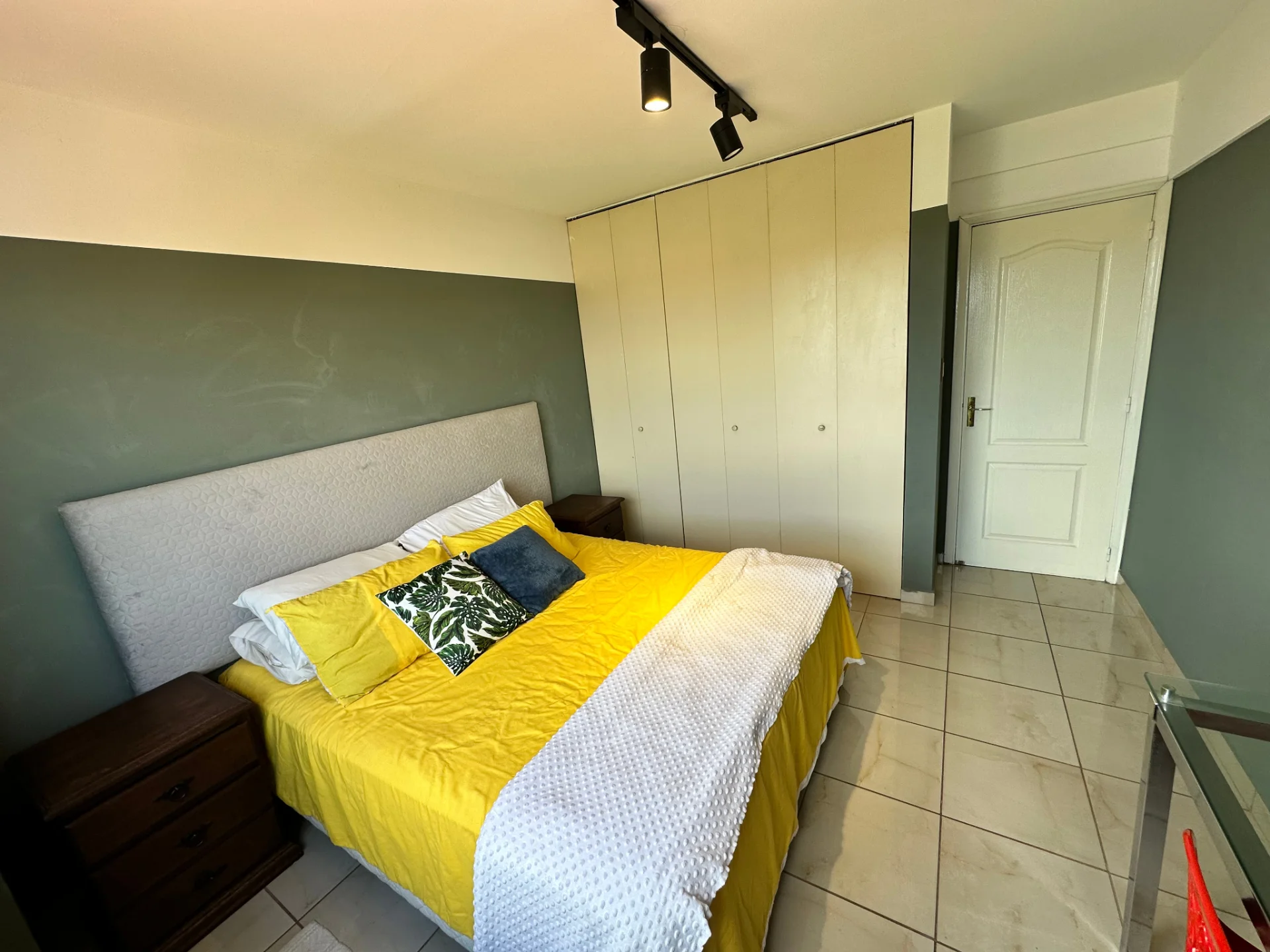 - 1 dormitorio equipado con cama de 2 plazas y media, cortinas, ropero empotrado, aire acondicionado.