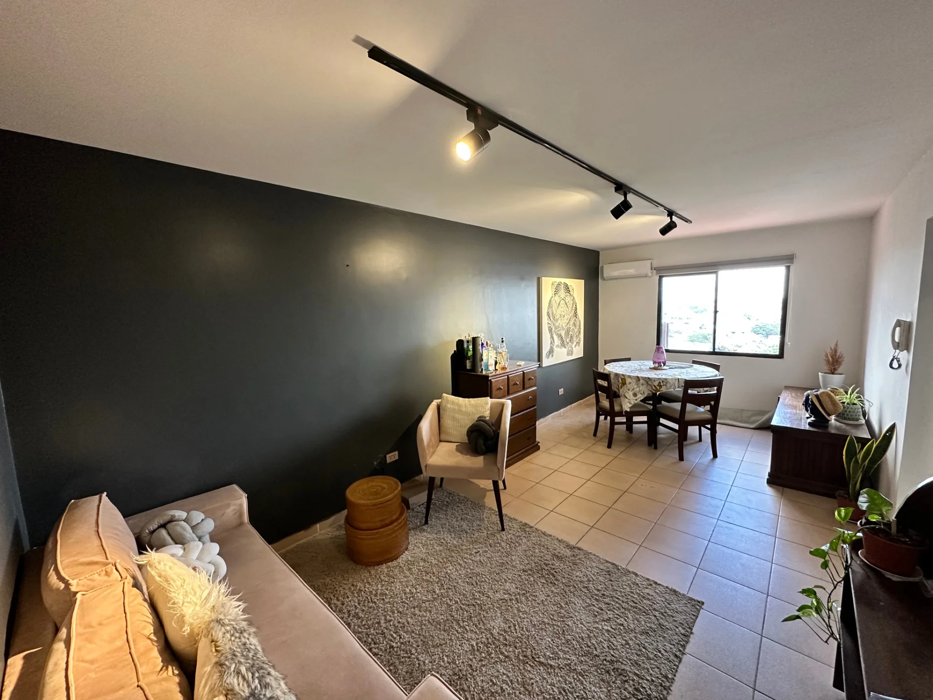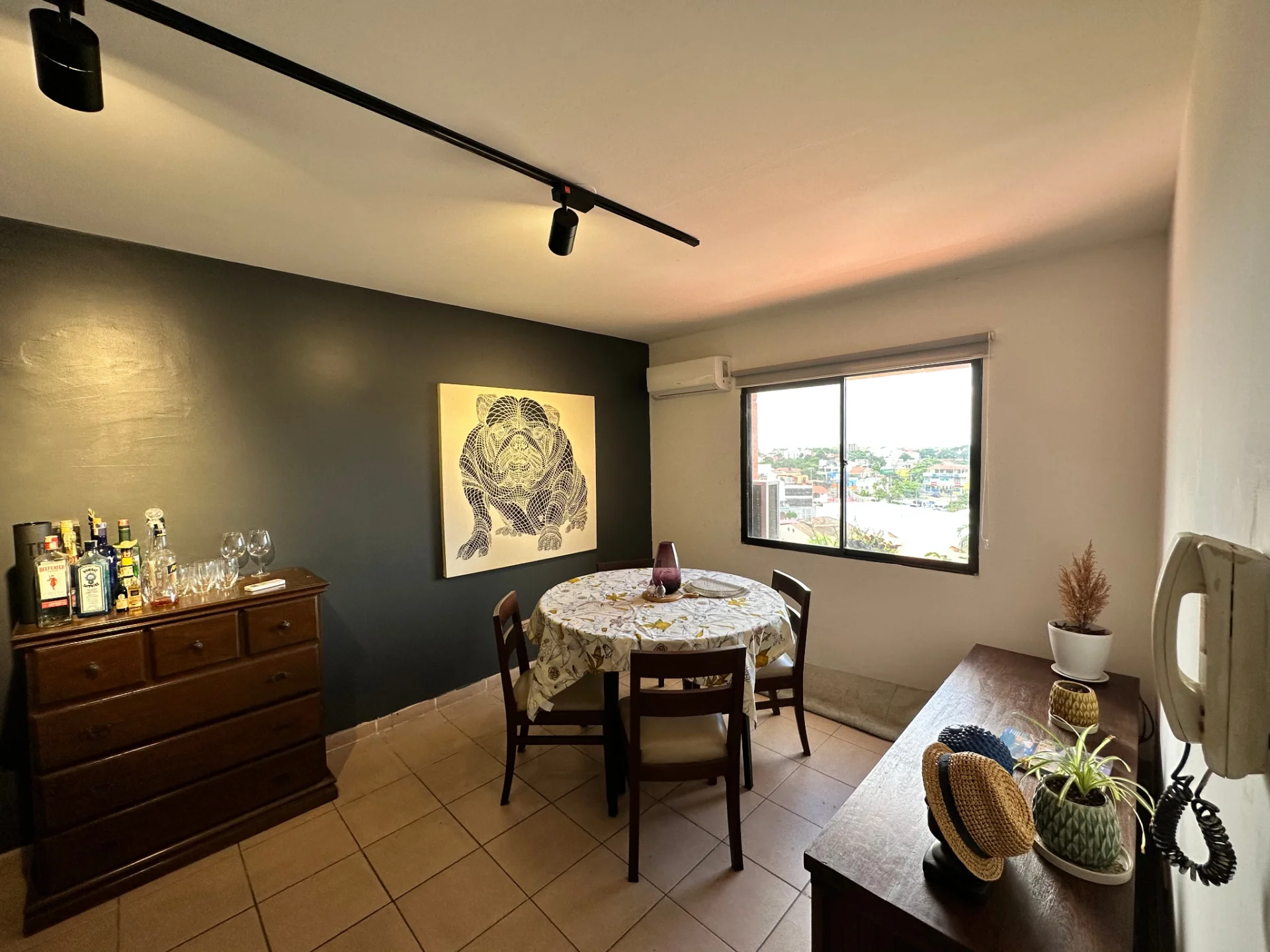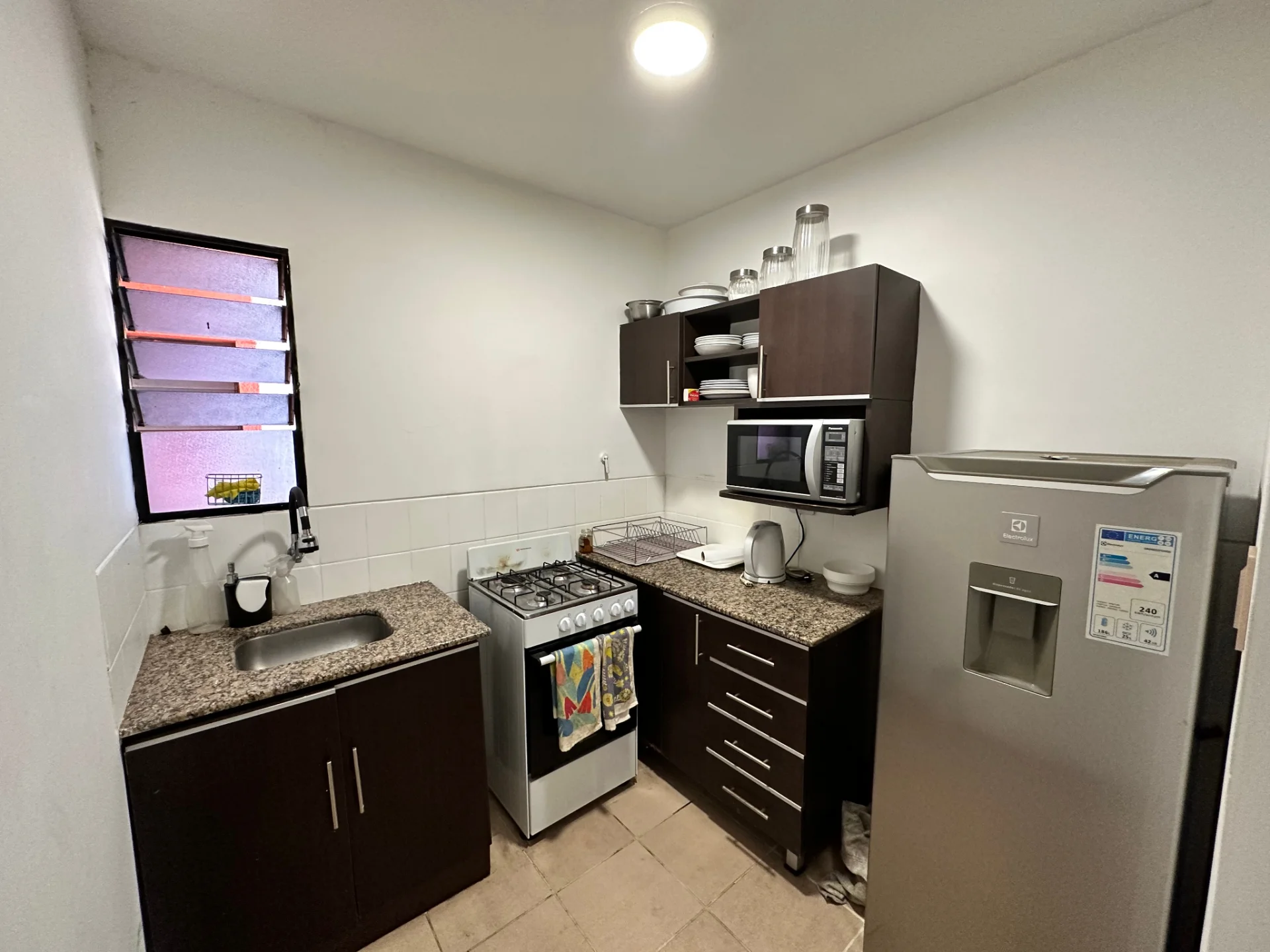 - Living comedor cocina integrada, equipado el living comedor con muebles de living, mesa comedor, cortinas, aire acondicionado, mesa de bar, intercomunicador. La cocina está equipada con muebles superiores e inferiores, cocina White Westingouse de 4 hornallas, 1 microondas Panasonic, 1 heladera Electrolux, menaje para 2 personas.