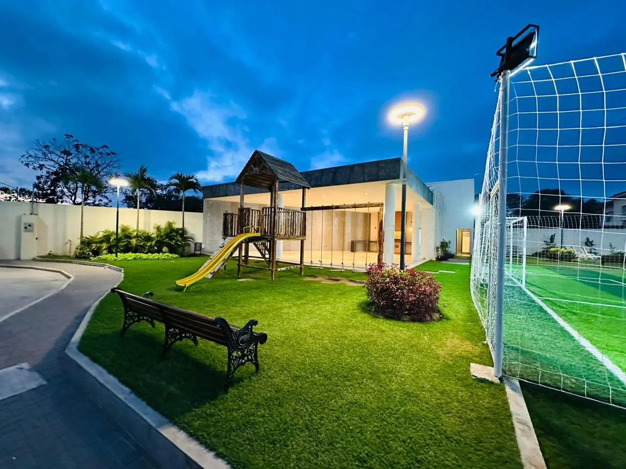 Churrasquera, Parque infantil, Cancha de pasto sintético, Piscina para adultos y niños.