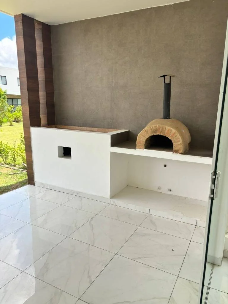 Patio con horno a leña y césped natural
