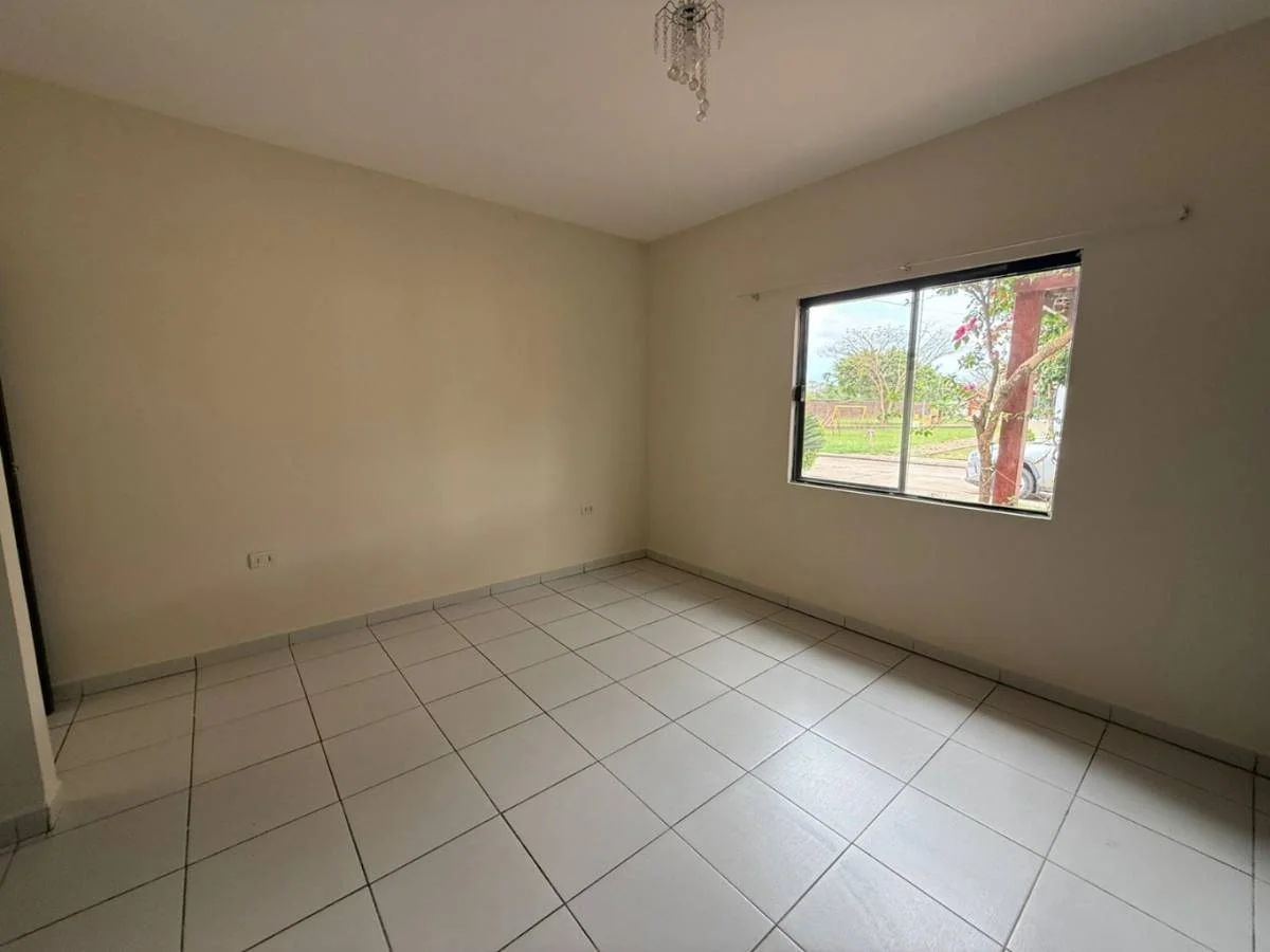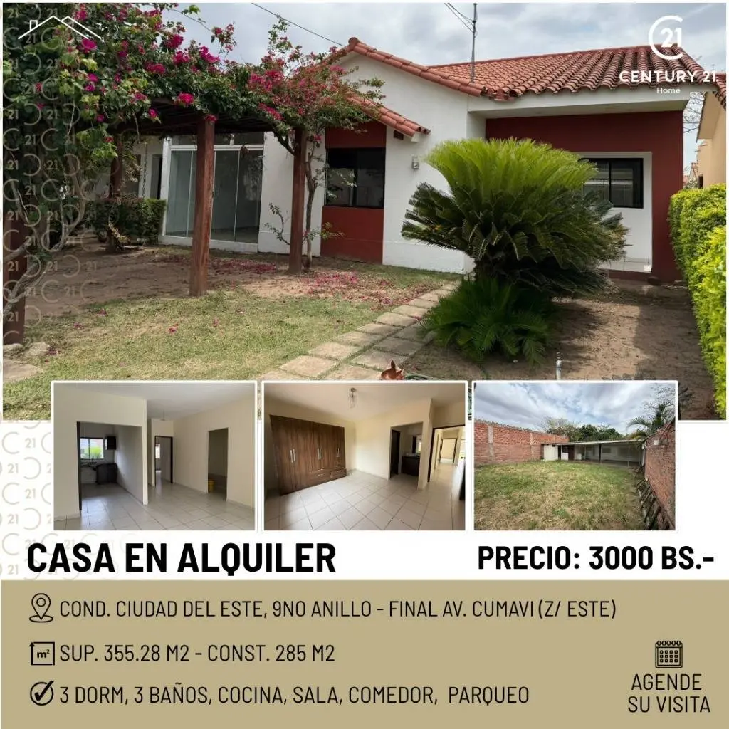 3 dosmitorios, 1 en suite, 2 baño a compartir, sala comedor, cocina, patio tracero con un pequeño cuarto atras, parque, espacio lateral con ceramica