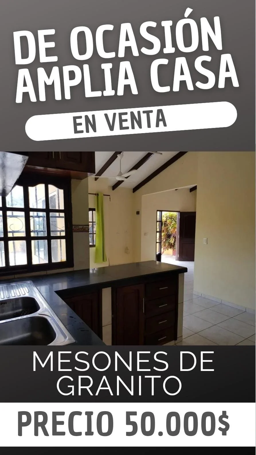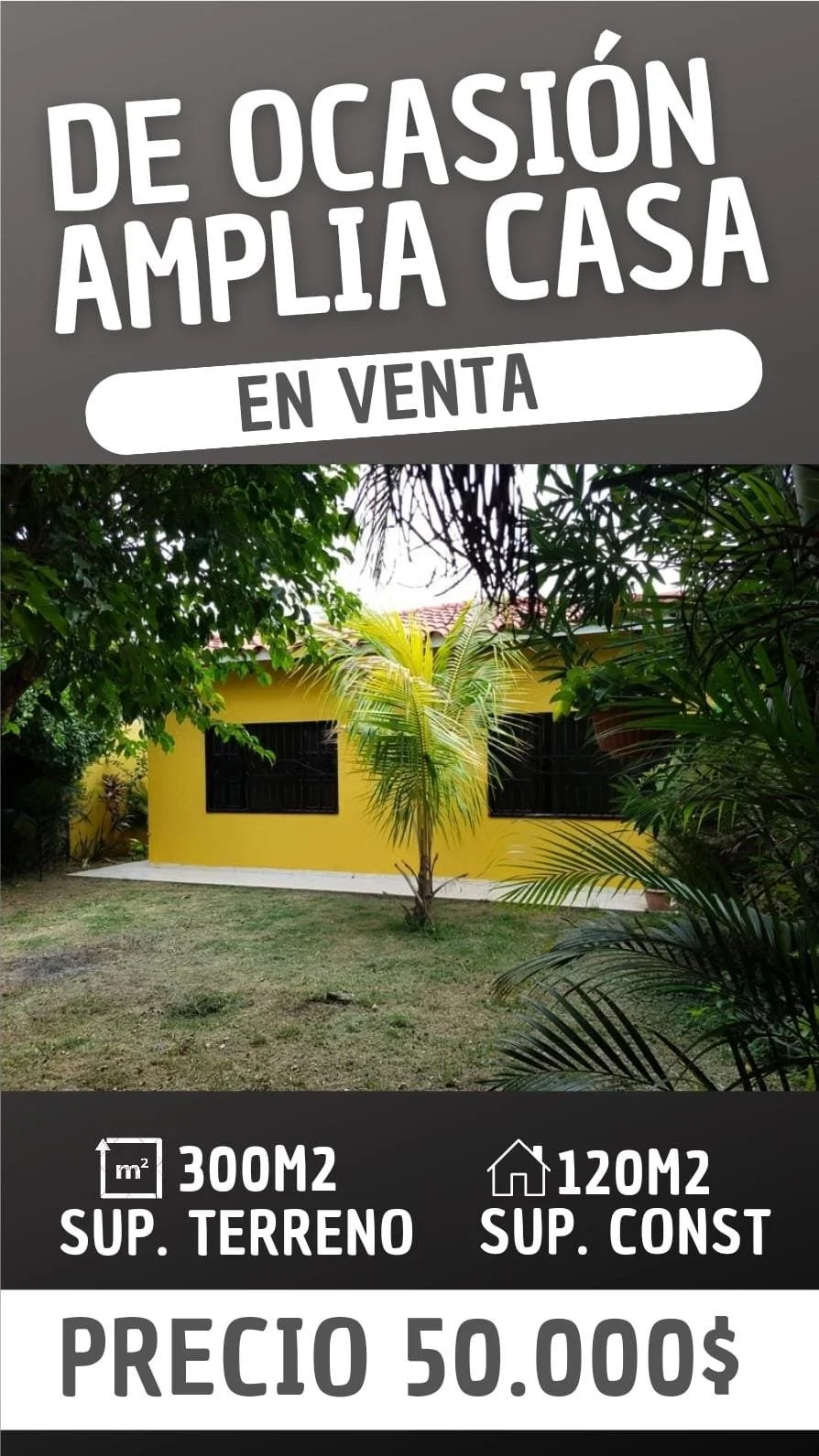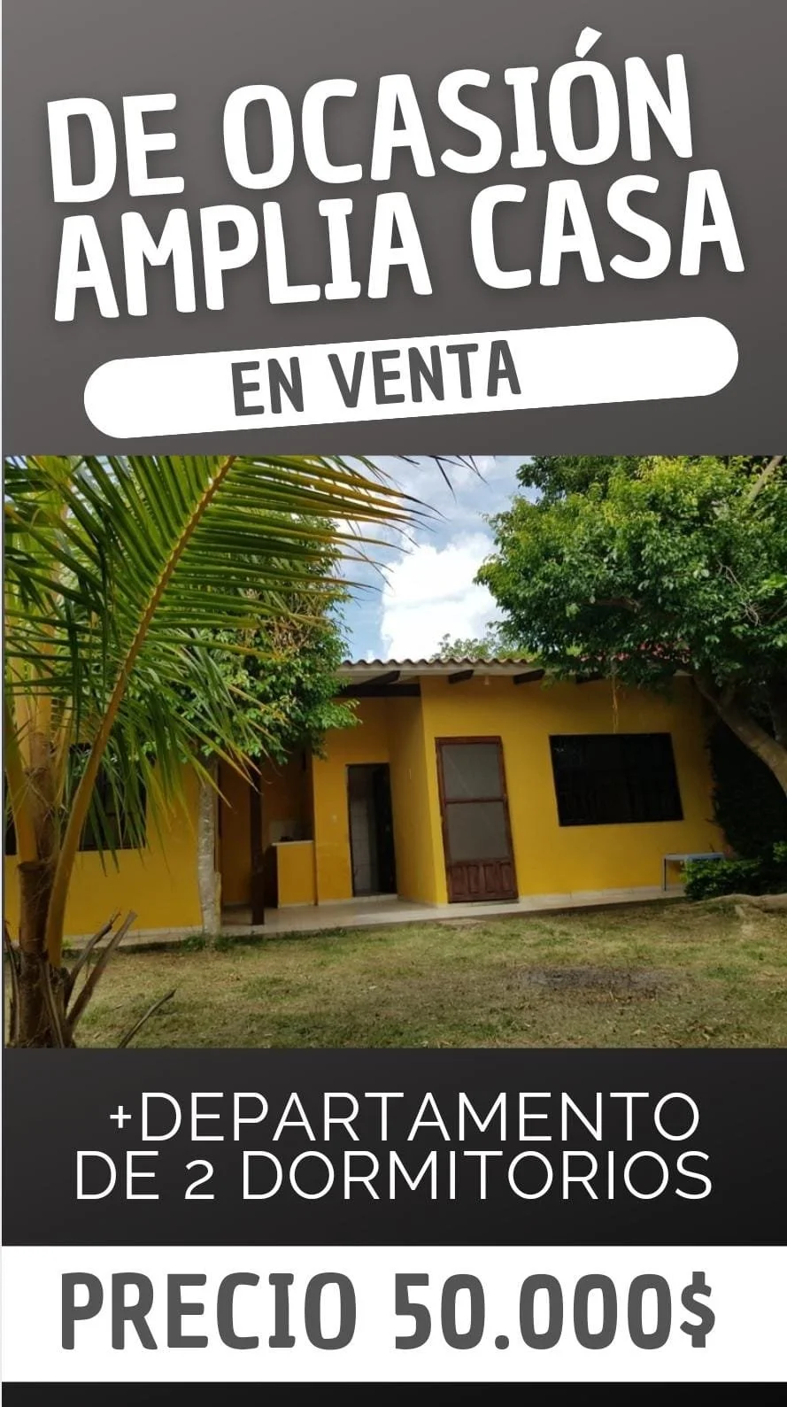 *LINDA CASA EN VENTA CON JARDIN + DEPARTAMENTO DE 2 DORMITORIOS* Superficie Terreno: 300 m²Superficie Construida: 150m² ✓3 DORMITORIOS✓1 BAÑO✓SALA COMEDOR✓COCINA ESTILO AMERICANA CON CAJONERIA COMPLETA y EXTRACTOR, AMPLIO PATIO DELANTERO CON GALERIA (PARA CHURRASQUERA, HAMACA,ETC) GARAJE PARA 2 VEHÍCULO, AMPLIO JARDIN TRASERO CON PLANTAS FRUTALES MAS DEPARTAMENTO DE 2 DORMITORIOS CON BAÑO PRIVADO AL FONDO CON LAVANDERIA Papeles en ordenENTREGA INMEDIATA UBICACIÓN :JUAN PABLO II próximo a satélite norte Líneas de transporte a la puerta. PRECIO: 50.000$OFERTABLEMAS información AL 75607112