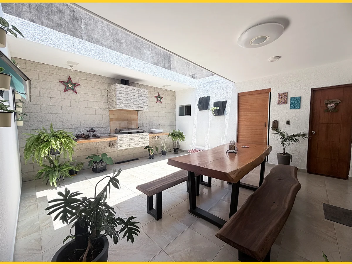 ⁃ Patio con churrasquera y mesa de madera con banquetas