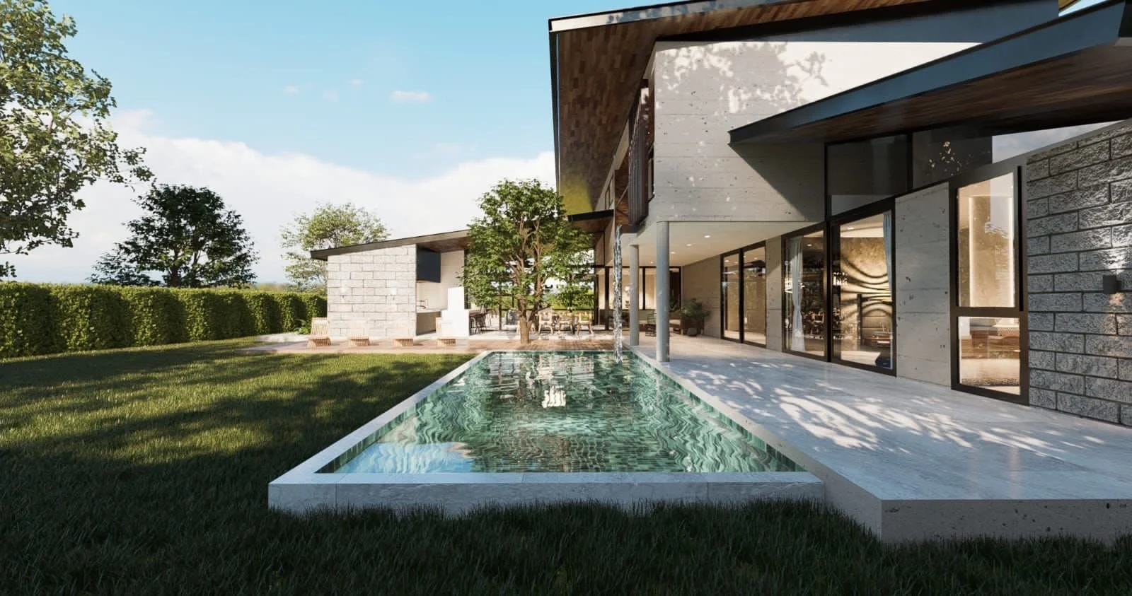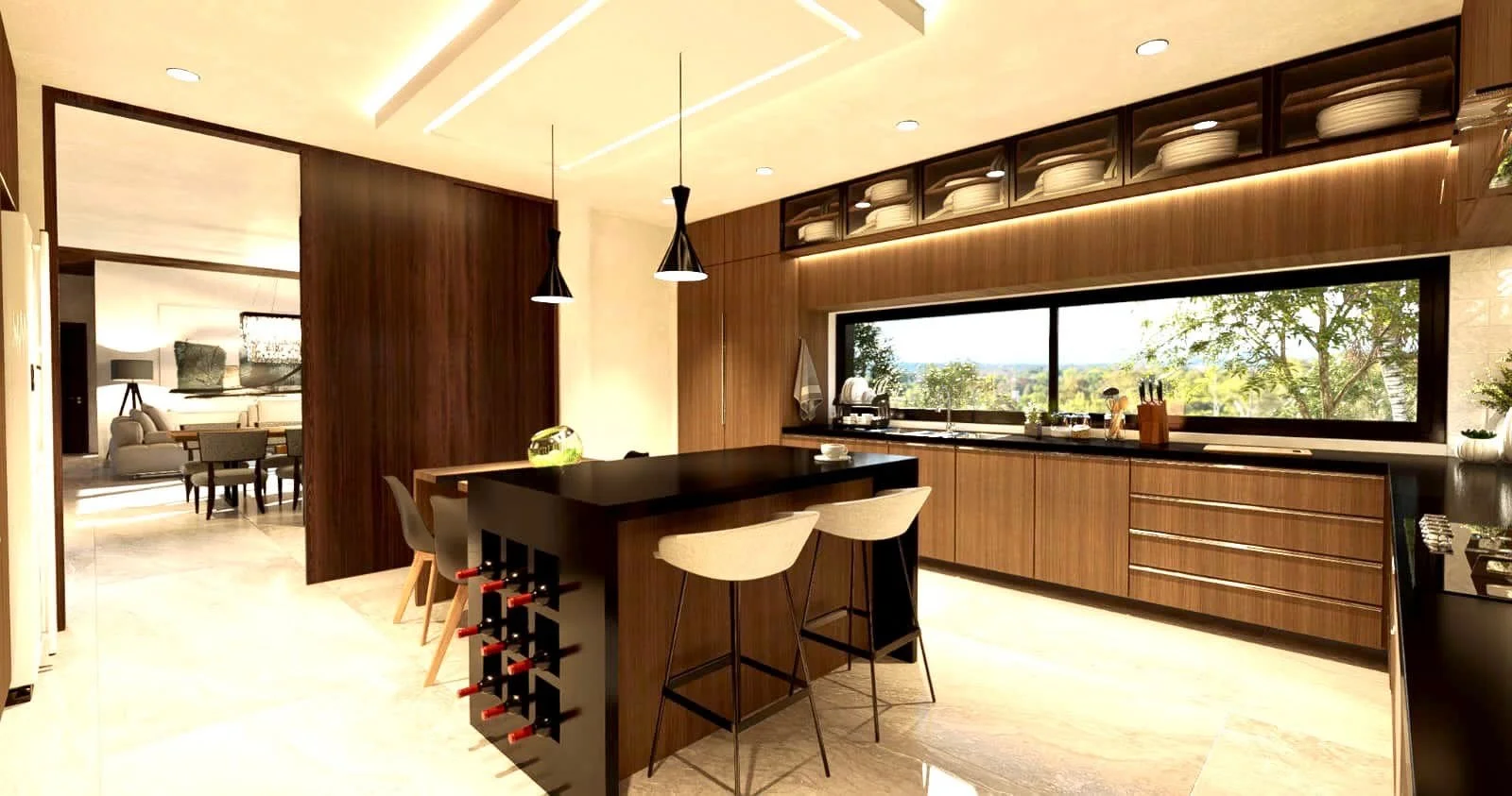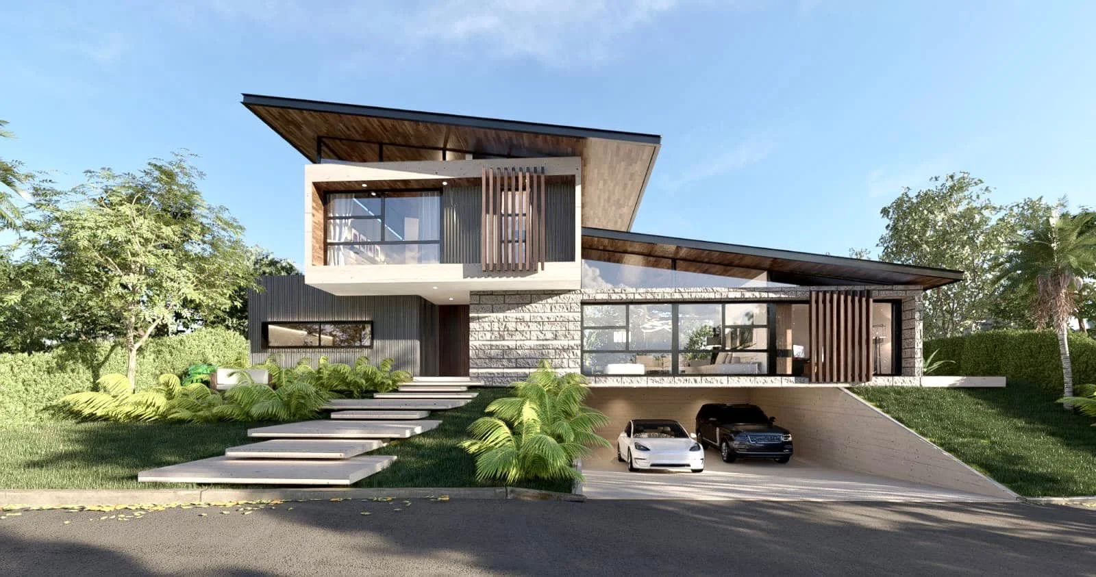 PB:Living y comedorMaster suiteCocina cerrada con Comedor de diarioDormitorio de visitasBaño visitas con ducha Area de lavandería techadaJardin con árboles Galería en LPiscina con lagarteroChurrasqueraPA:2 suite junior 2 Sala de tv