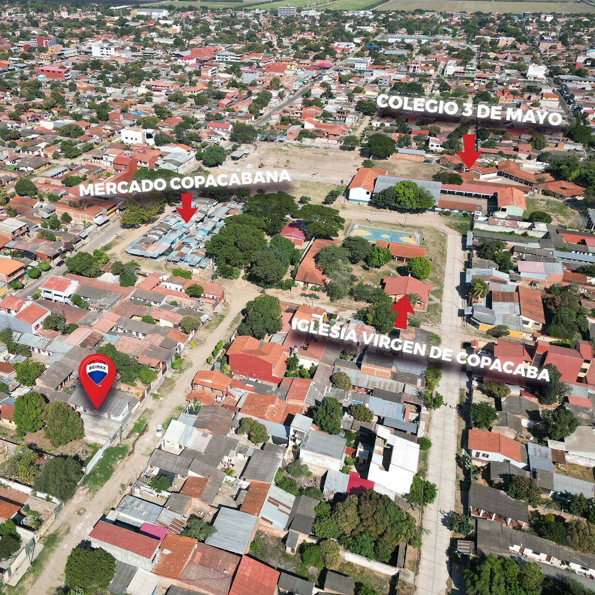 Servicios Cercanos: Cerca de colegio 3 de Mayo, mercado Copacabana, Iglesia Virgen de Copacabana, centros de salud y áreas recreativas.