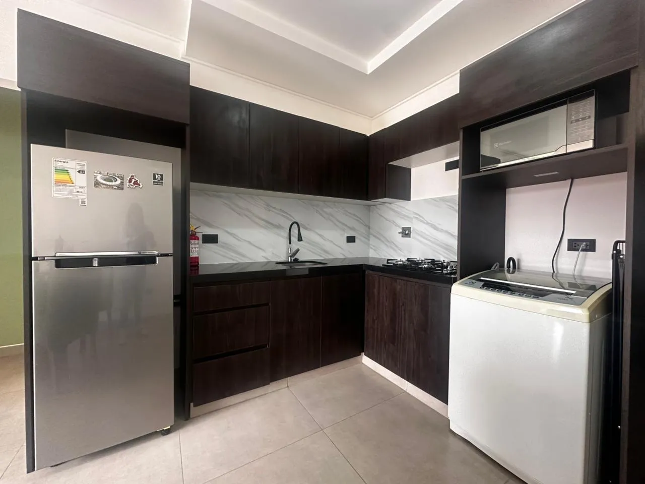 - Cocina equipada con cajonería alta y baja, cocina encimera.