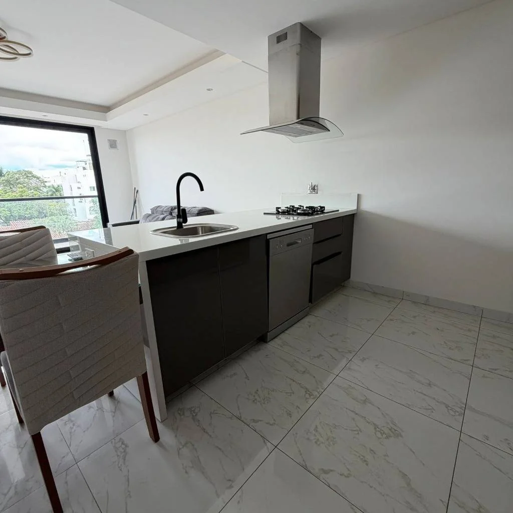 • Cocina equipada (encimera, horno, campana, refrigerador, horno microondas, lava platos, nevera de vinos )