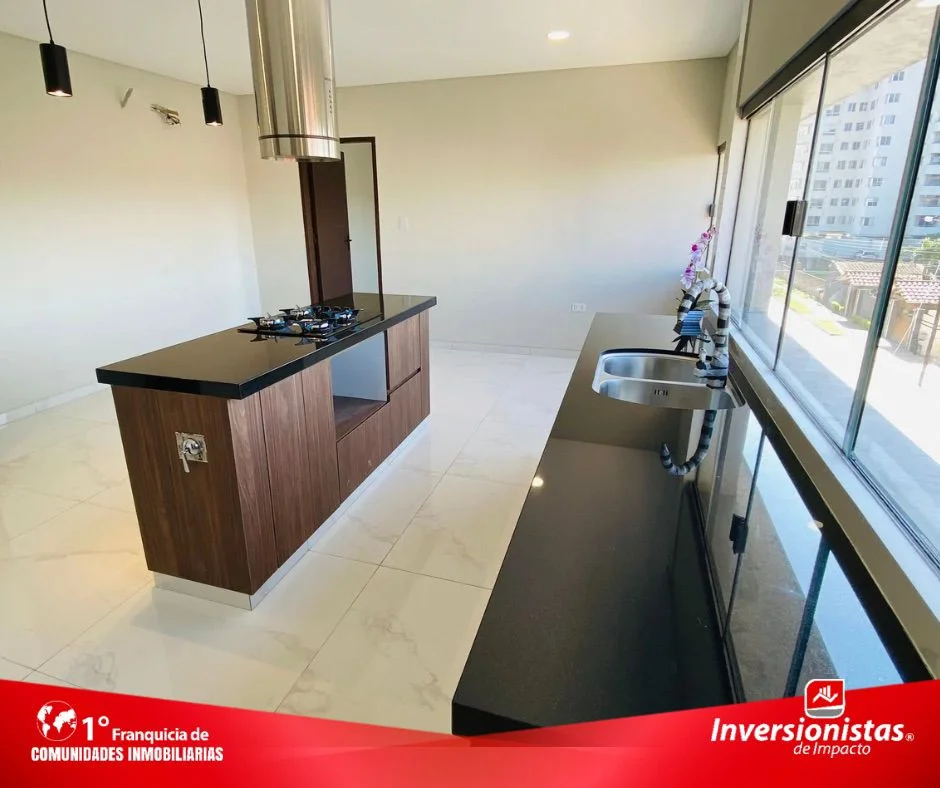 Cocina americana con mueblería baja, campana, cocina encimera