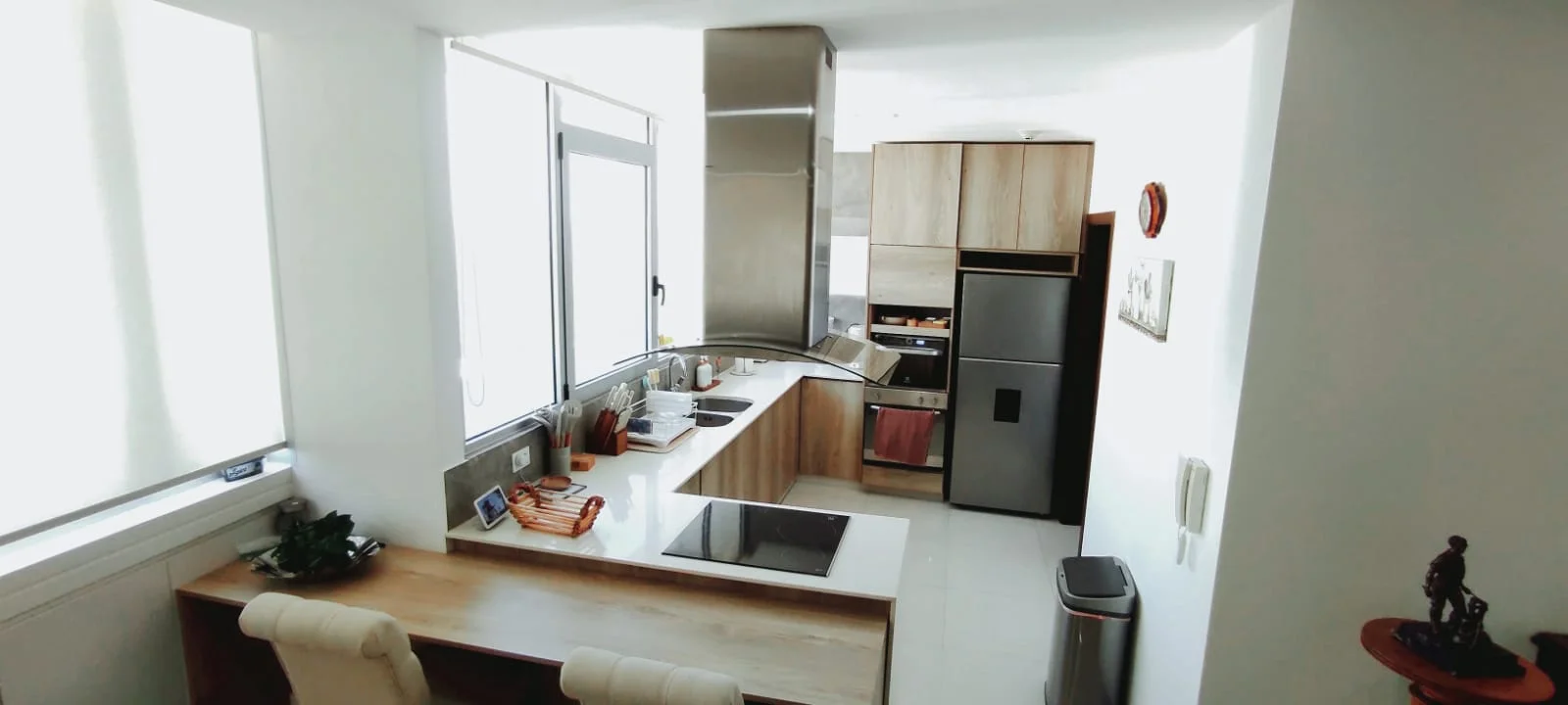 Elegante living comedor con cocina integrada.
