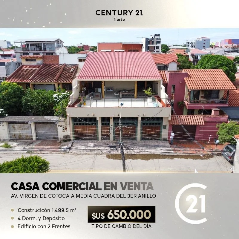 ???? EDIFICIO COMERCIAL EN VENTA – DOBLE FRENTE???? Av. Virgen de Cotoca, a media cuadra del 3er anillo✔ Uso de suelo mixto???? Terreno: 600 m²???? Construcción: 1.488,5 m²???? Precio: $us 650.000(Forma de pago: efectivo o al tipo de cambio del día)✨ Características destacadas:▪ Doble frente: sobre avenida troncal y calle paralela▪ Área comercial tipo showroom▪ Oficinas▪ Vivienda con 4 dormitorios▪ Depósito???? Ubicación estratégica:▪ Zona hospitalaria (Hospital Japonés)▪ Parque Industrial▪ Feria Barrio Lindo▪ Feria de la Construcción▪ Estación Bimodal▪ Sobre Ruta Nacional R4 (conexión a Chiquitania / Brasil)???? Contáctame para más información o agendar una visita