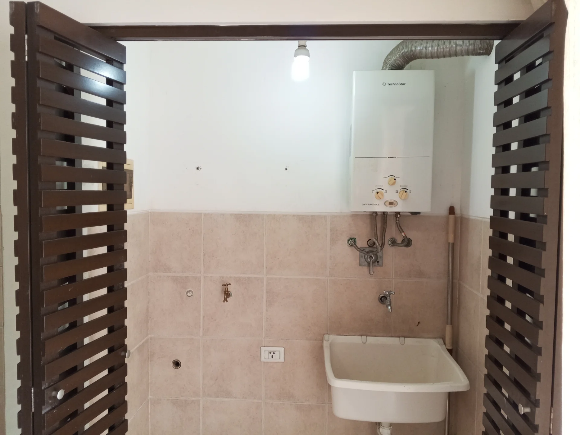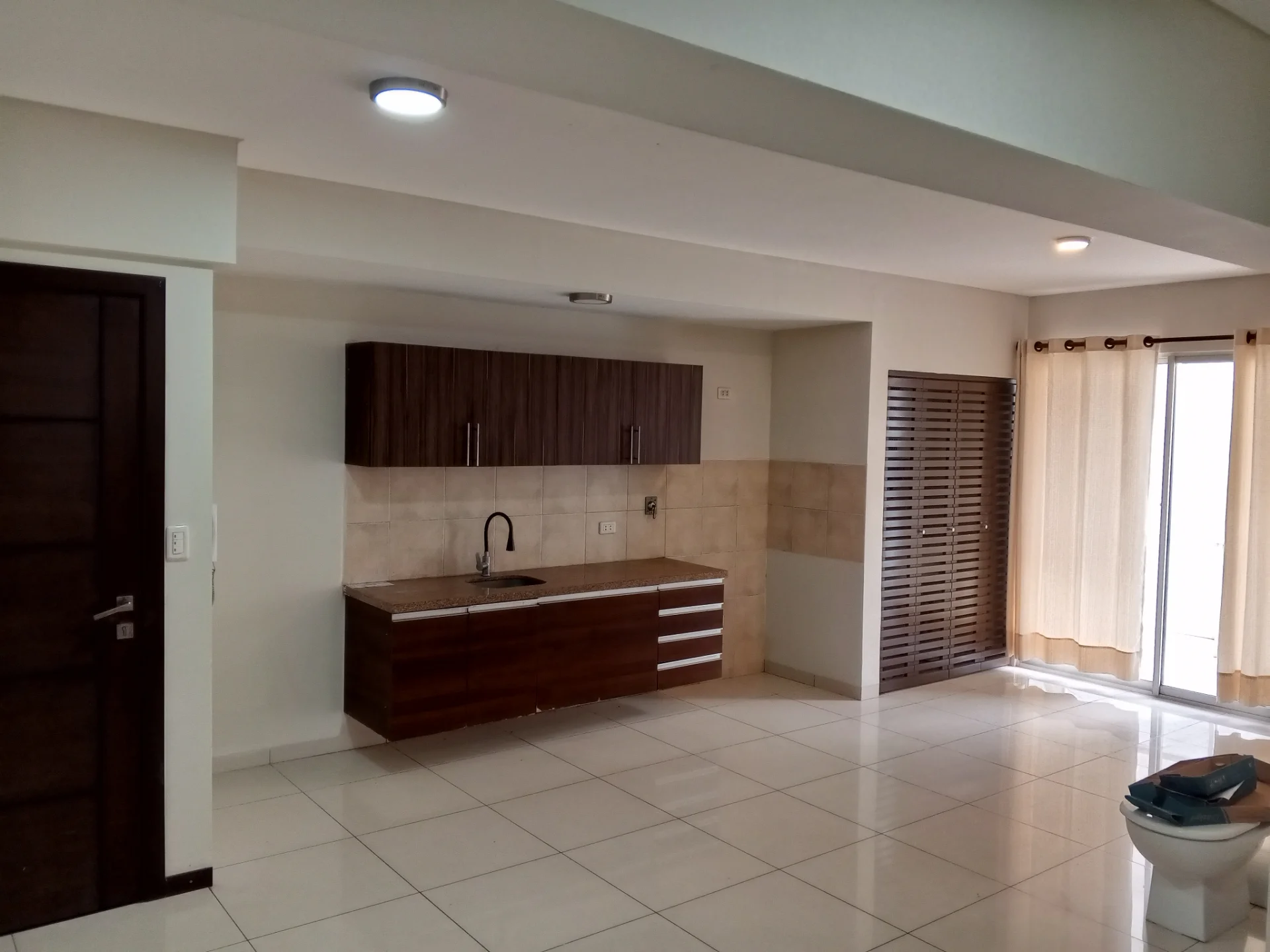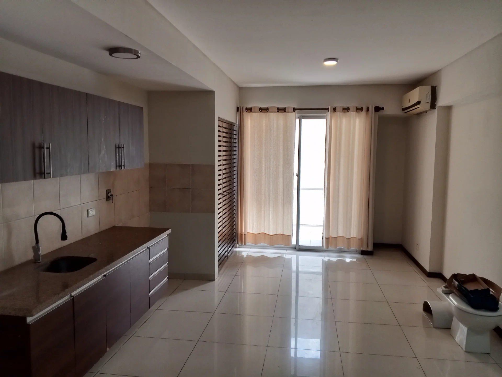 Amplio living cocina comedor integrado con acceso a balcón, equipado con muebles de cocina superior e inferior, intercomunicador, aire acondicionado, cortinas, área de lavandería con espacio para lavadora. Tiene gas domiciliario.