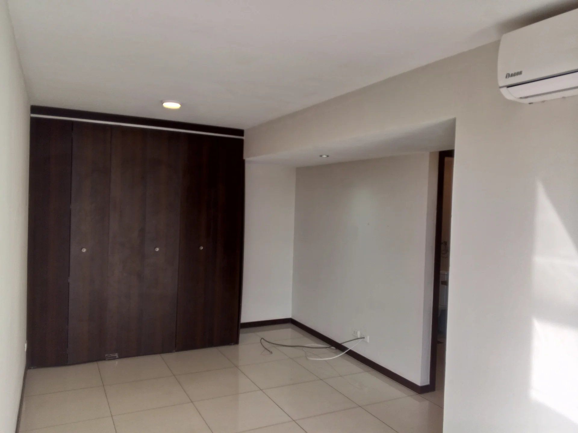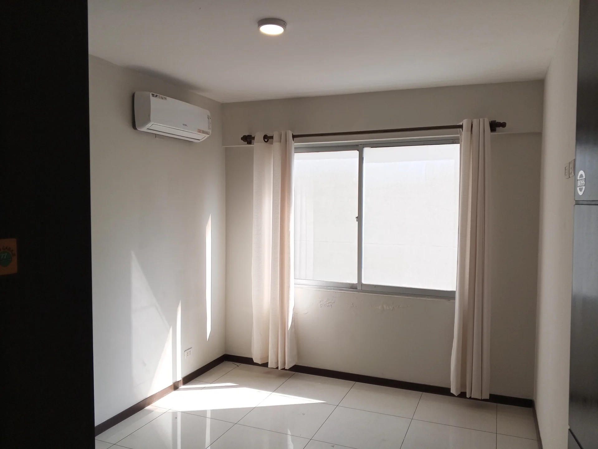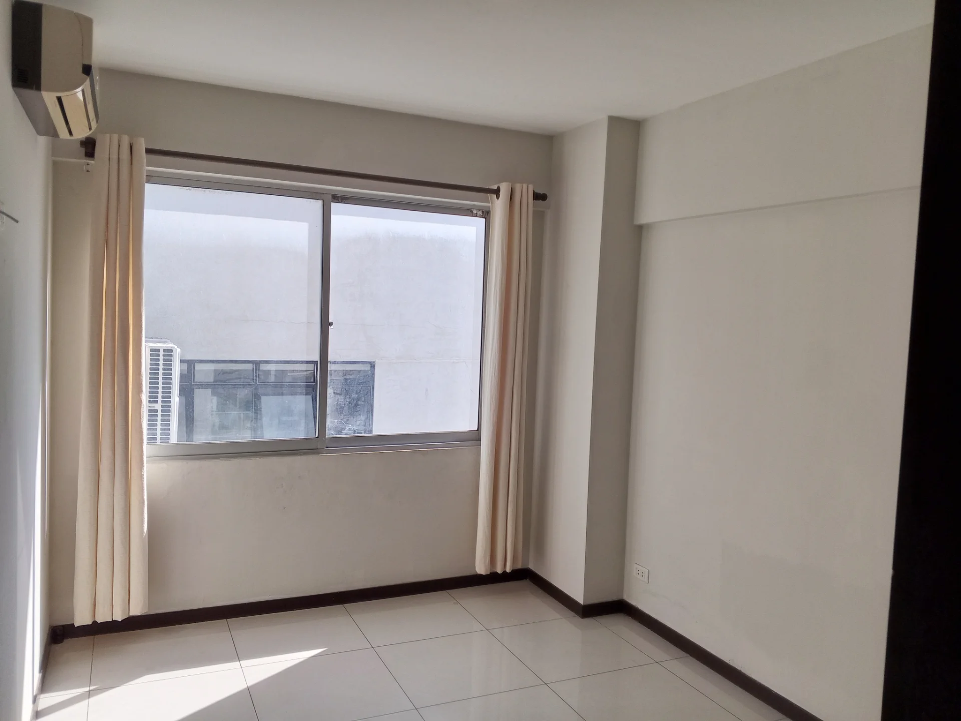 1 dormitorio equipado con ropero empotrado, aire acondicionado y cortinas.