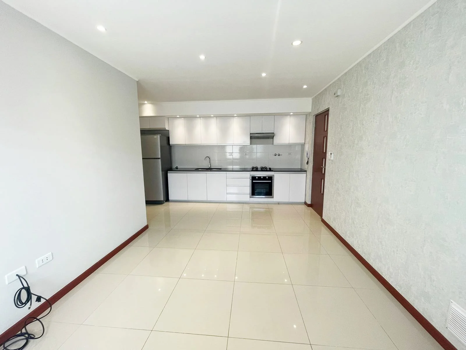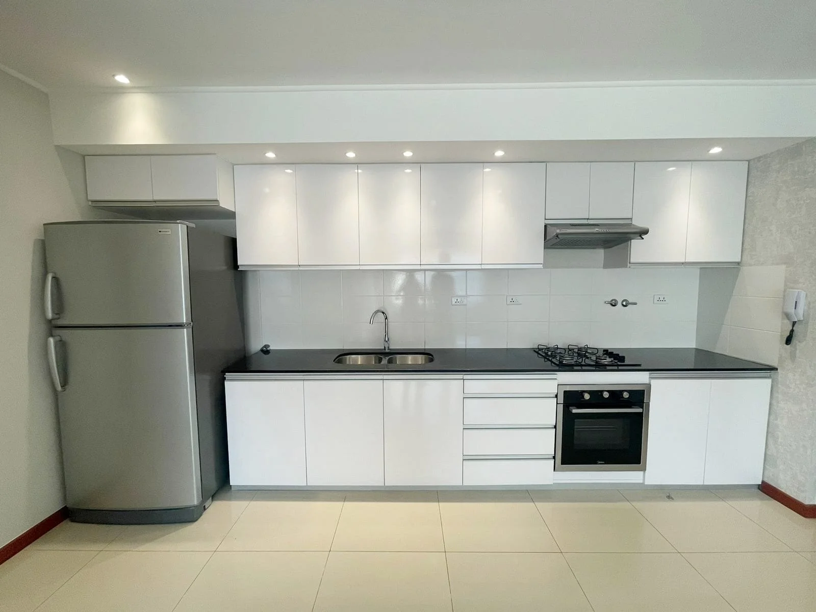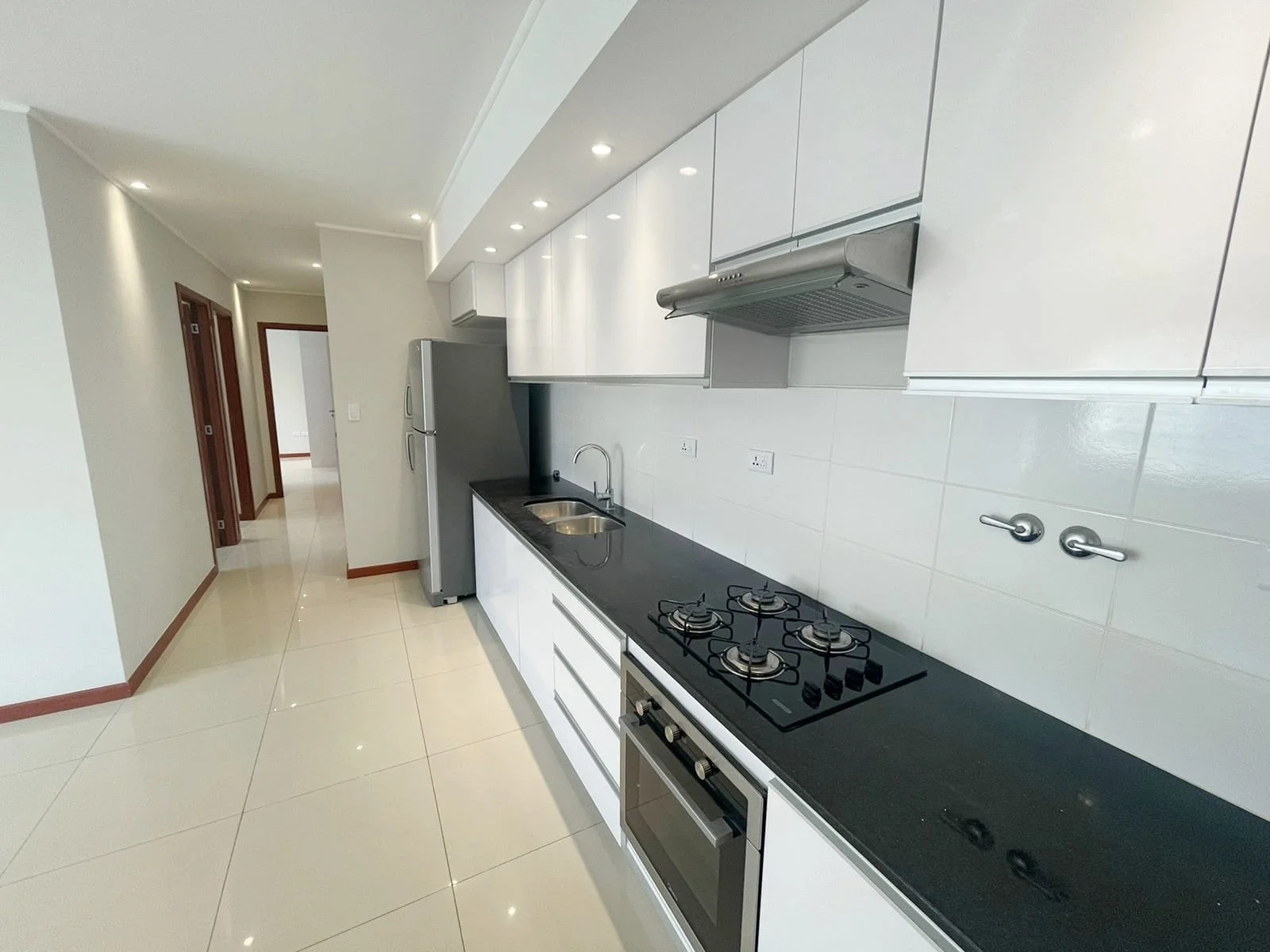- Cocina equipada con encimera, extractor, horno y heladera
