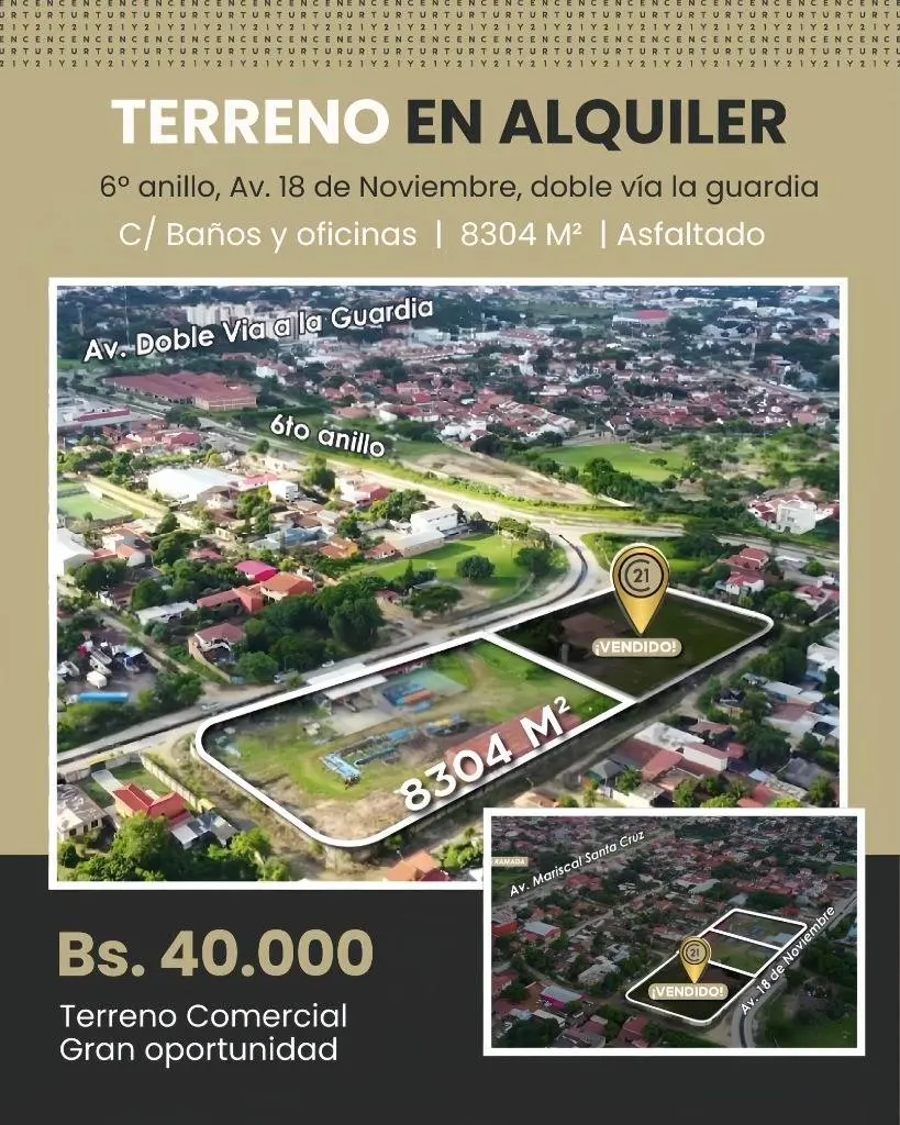 ALQUILER TERRENO COMERCIAL UBICADO EN LA AV 18 DE NOVIEMBRE 6TO ANILLO A PASOS DE LA AV DOBLE VIA LA GUARDIA, ACCESO ASFALTADO, AV DE DOBLE VIA, EXCELENTE CONECTIVIDAD, EL TERRENO ESTA 100% CON BARDA DE ALTURA, PORTONES PARA INGRESO DE CAMIONES, IDEALES PARA OPERACIONES INDUSTRIALES DE GRAN ESCALA, INFRAESTRUCTURA COMPLETA: ILUMINACION, SERVICIO DE AGUA, LUZ MONOFÁSICA Y TRIFÁSICA.
