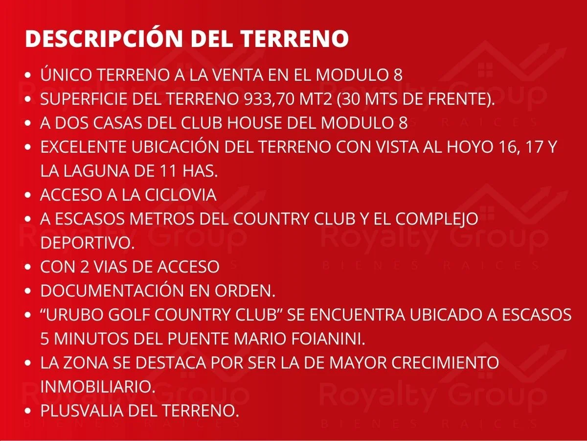 ✓ “URUBO GOLF COUNTRY CLUB” SE ENCUENTRA UBICADO A ESCASOS 5 MINUTOS DEL PUENTE MARIO FOIANINI.